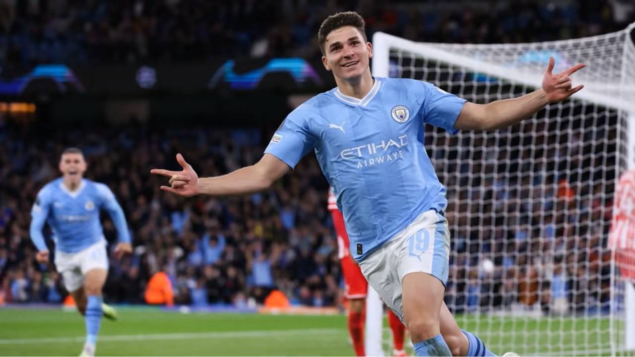 2023-24赛季欧冠1/4决赛,曼城点球大战不敌皇马出局,阿尔瓦雷斯当时还罚进了点球。
