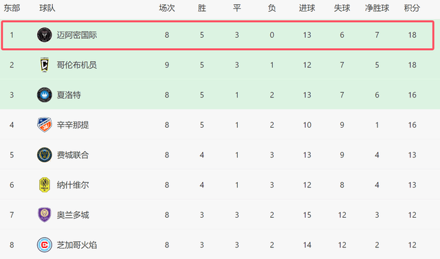本场过后,迈阿密国际开赛8轮不败,拿到3分之后,反超了哥伦布机员,在东部登顶。不过截至目前,本轮其他比赛还没开始,接下来积分榜的排名还有可能发生变化。