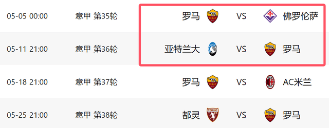 - 罗马接下来两轮将分别对阵佛罗伦萨和亚特兰大,这两场比赛同样至关重要。一旦罗马丢分,很可能会被其他争四球队拉开差距。