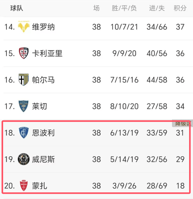 随着本赛季意甲正式结束,降级3队也已经出炉。除了蒙扎和恩波利之外,威尼斯队也不幸降级。最后一轮比赛,他们在主场2-3输给尤文,最终无缘保级。下赛季,这3支球队将征战意乙,希望他们能重新振作,争取早日杀回意甲!
