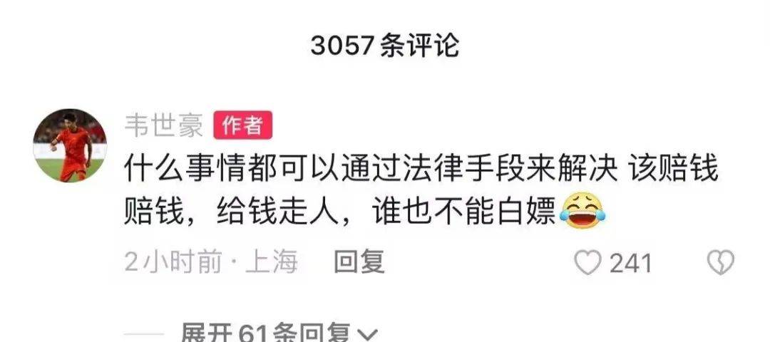 而对于嗨球青训与小球员之间的纠纷,韦世豪也表达了自己的看法。他写道:“什么事情都可以通过法律手段来解决,该赔钱赔钱,给钱走人,谁也不能白嫖。”