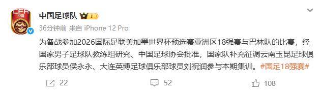 今天下午,国足在社交媒体发文称,经国足教练组研究决定,补招云南玉昆球员侯永永和大连英博球员刘祝润参加集训,备战18强赛最后一场与巴林队的比赛。