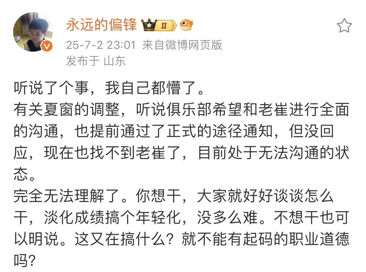 山东泰山队面临的问题很多,目前急需要解决的两点,第一手中的年轻新星该如何培养,第二崔康熙的去留问题。据媒体人陈永透露,俱乐部想要和崔康熙进行沟通,但没有得到回应,现在找不到他了,处于无法沟通状态。韩国教练是不装了,彻底破罐破摔了,完全不顾球队的未来,合同还剩下半年等着拿违约金。不管他想不想干,起码得跟俱乐部有沟通。