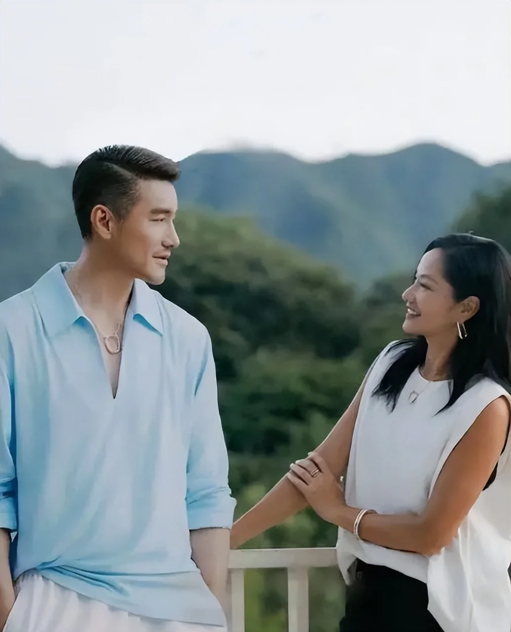 画面中,胡兵身着浅蓝色的休闲风上衣,搭配简约项链,发型利落有型;瞿颖则以白色无袖上衣搭配黑色下装,佩戴精致的耳饰、项链和手镯,整体造型时尚干练。两人在绿意盎然的山水背景前,眼神互动充满默契,展现出一种成熟且有质感的 CP 氛围。