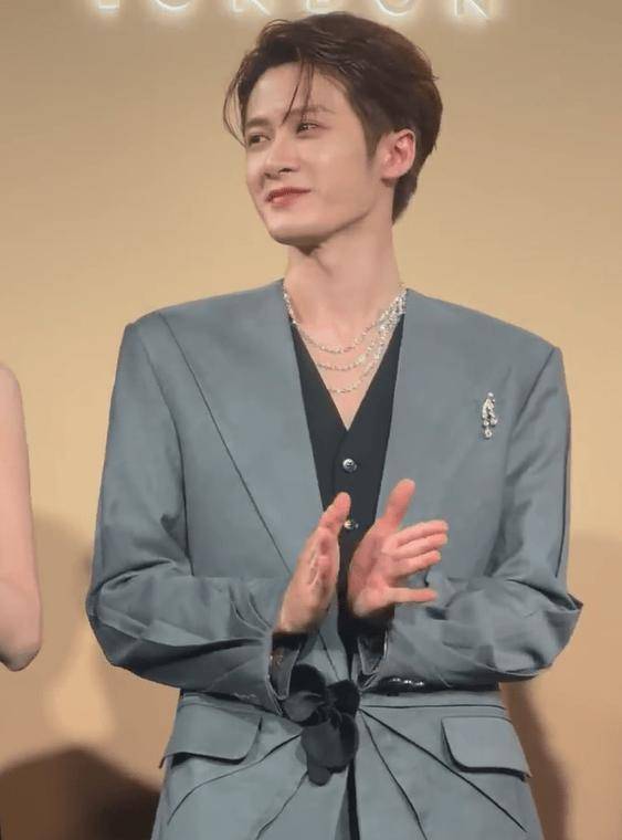 这次他一身灰色西服套装,配上黑色深V内搭与黑色腰花,设计新颖也非常有型。
