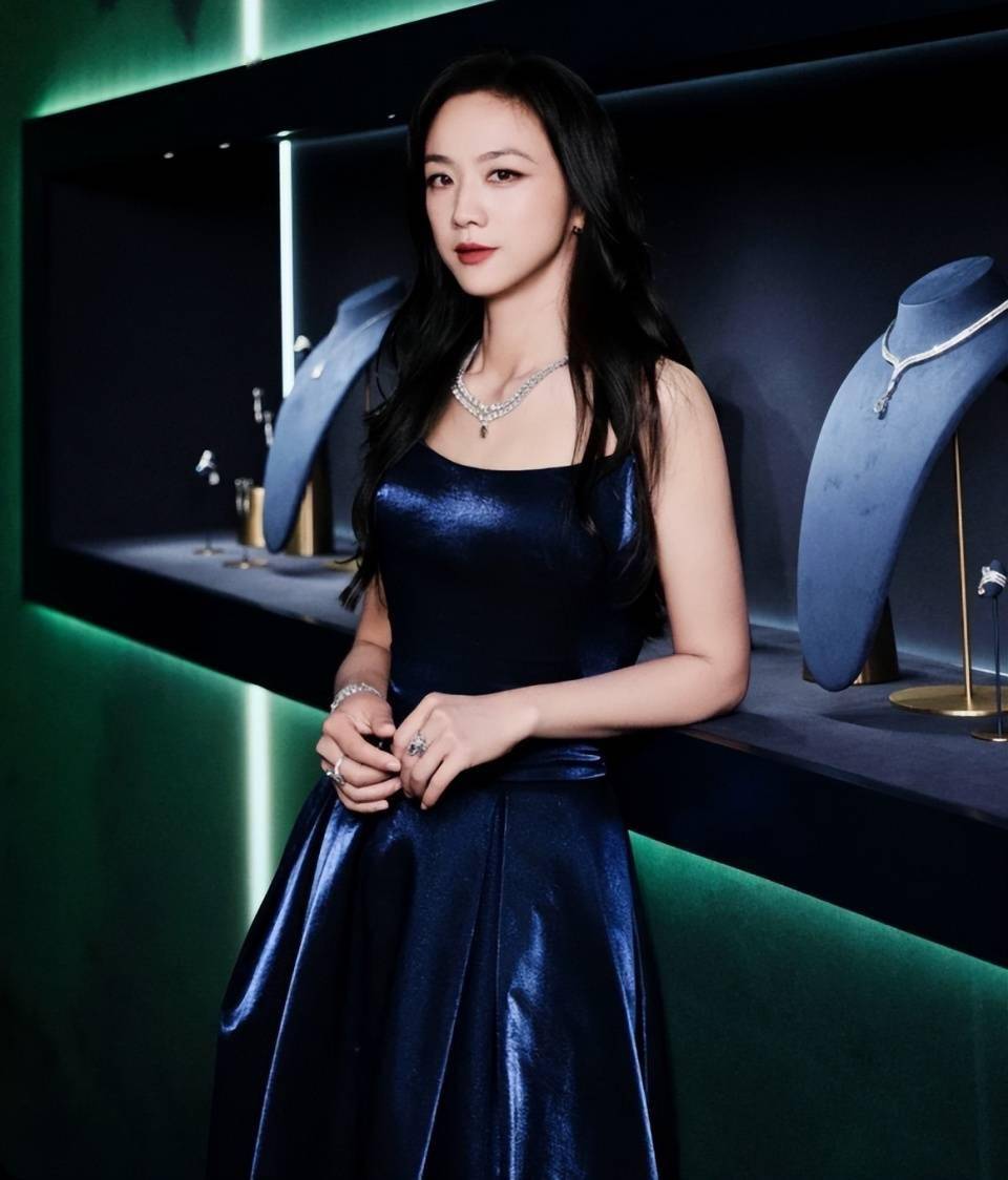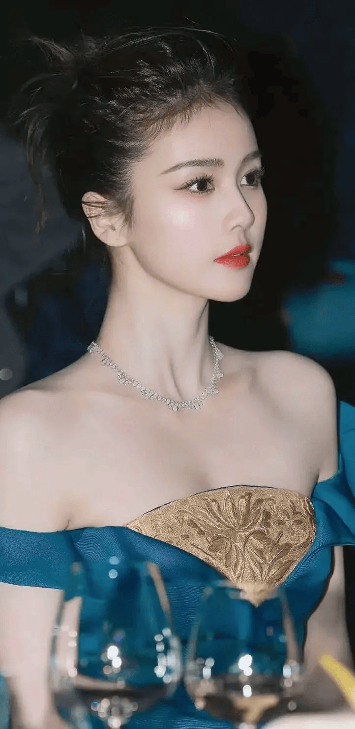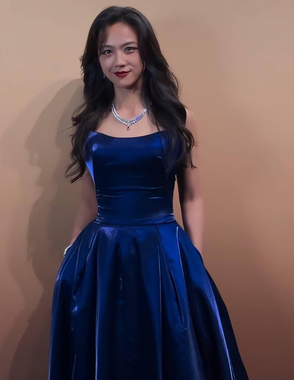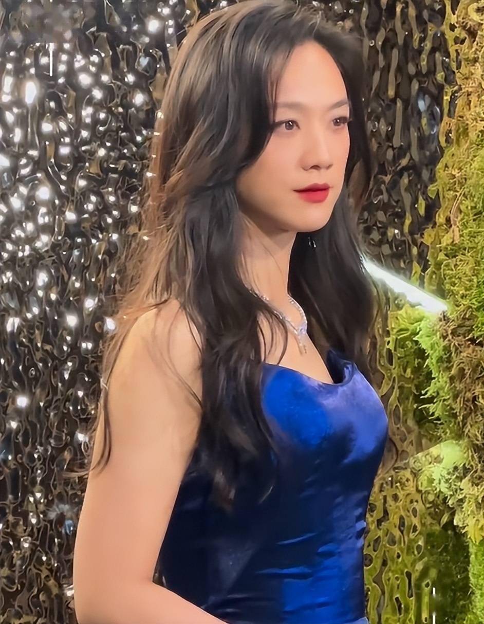 她选择的是一身宝蓝色抹胸礼服,在一众黑灰色中脱颖而出。