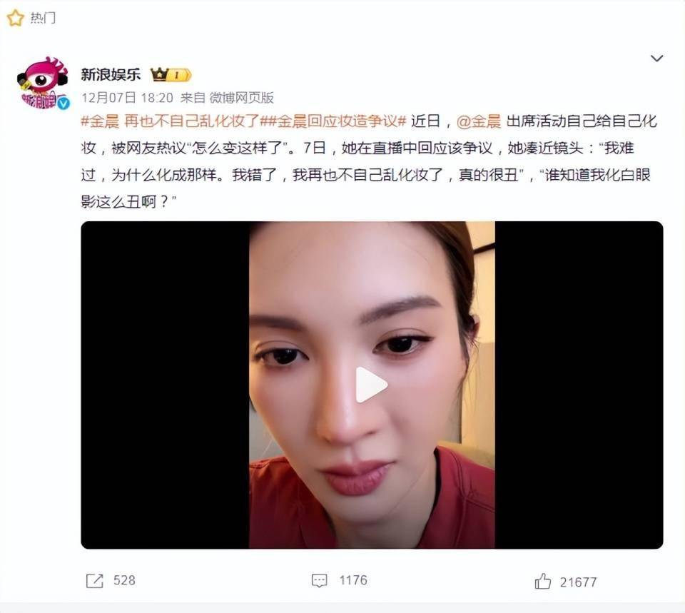 金晨又在出席活动时,引发“变脸”争议,随即她本人在直播中亲自回应:“我再也不自己乱化妆了!”