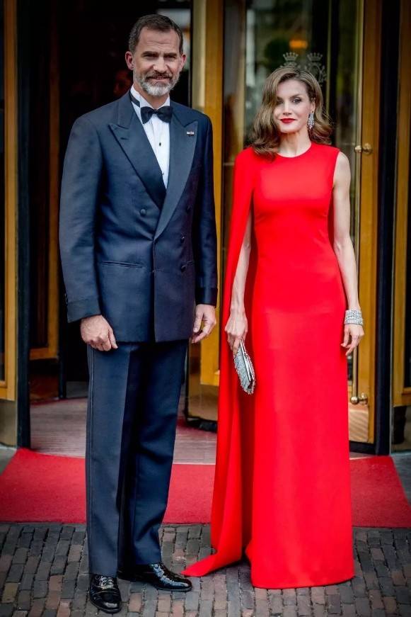 西班牙的莱蒂西亚王妃,她身穿黑色毛边斗篷,搭配红色不对称连衣裙,虽为重复穿着单品,但鲜明的红色主调展现了华丽感。耳饰的多彩配色增添层次,展现了她高超的搭配功力。最惊艳的是她选择了低跟鞋,3-4厘米的鞋跟完美驾驭了典礼的正式感与华丽度。漆皮鞋面与不对称设计的斗篷和裙摆,成为整体造型的点睛之笔。