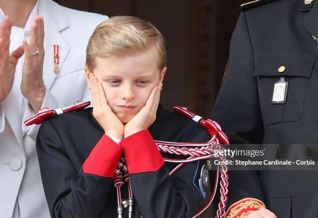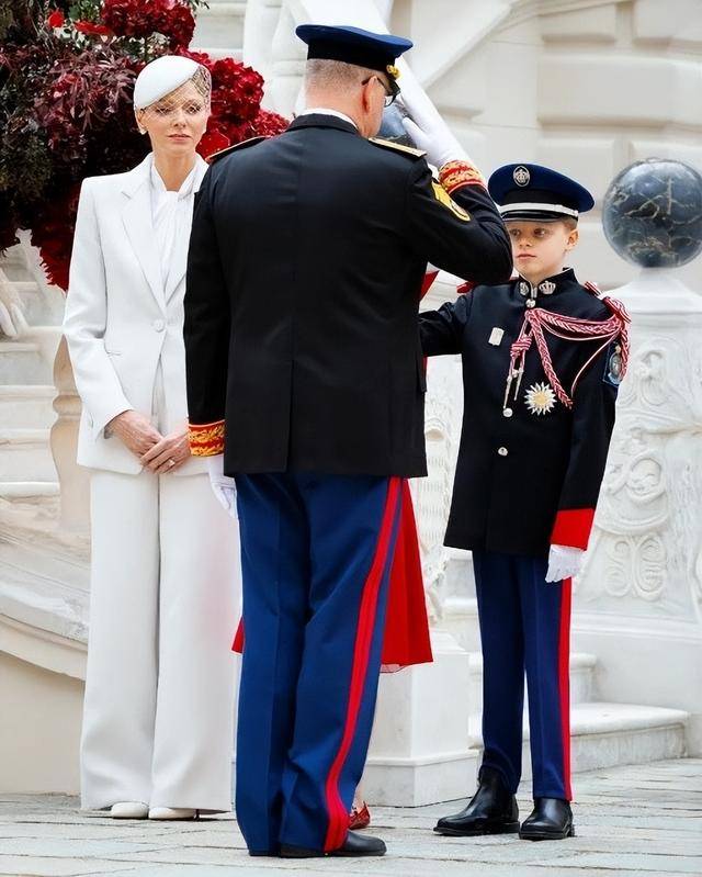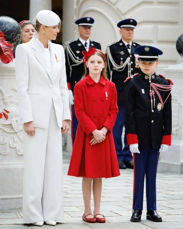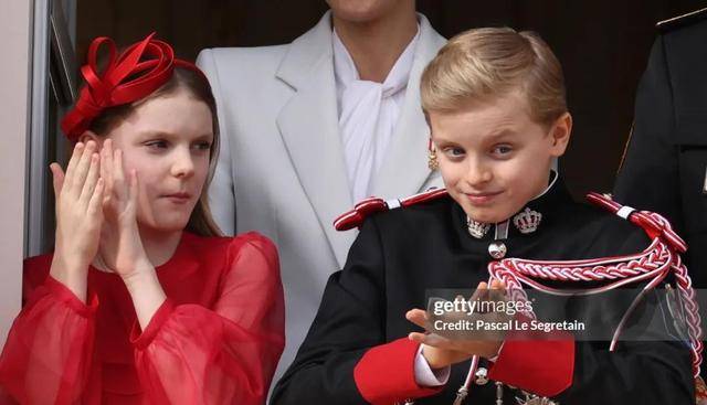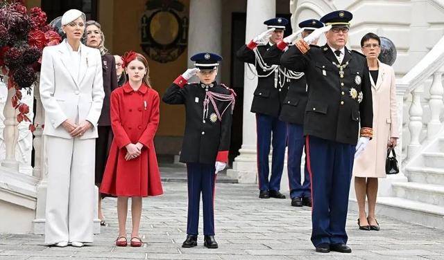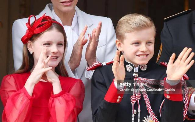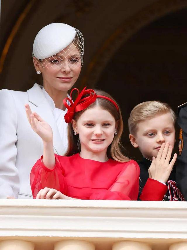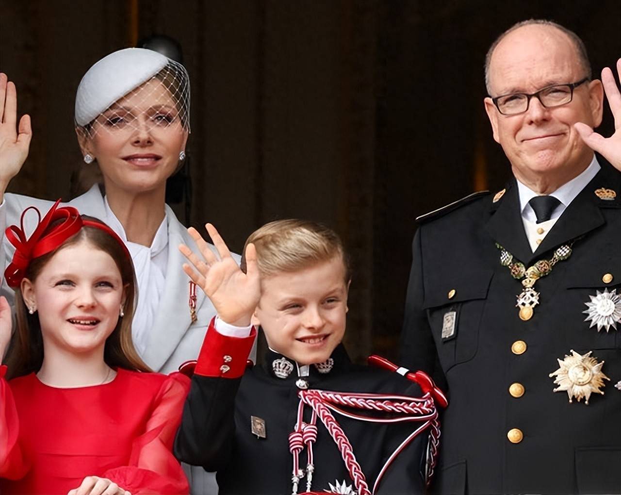 作为王位第一顺位继承人,雅克王子在阳台环节身着微缩版军装,与父亲阿尔贝二世的制服呼应,站立时姿态笔直、目光坚定;加布里埃拉公主则身穿亮红色外套,频繁向人群挥手微笑。