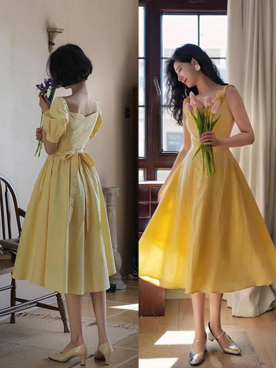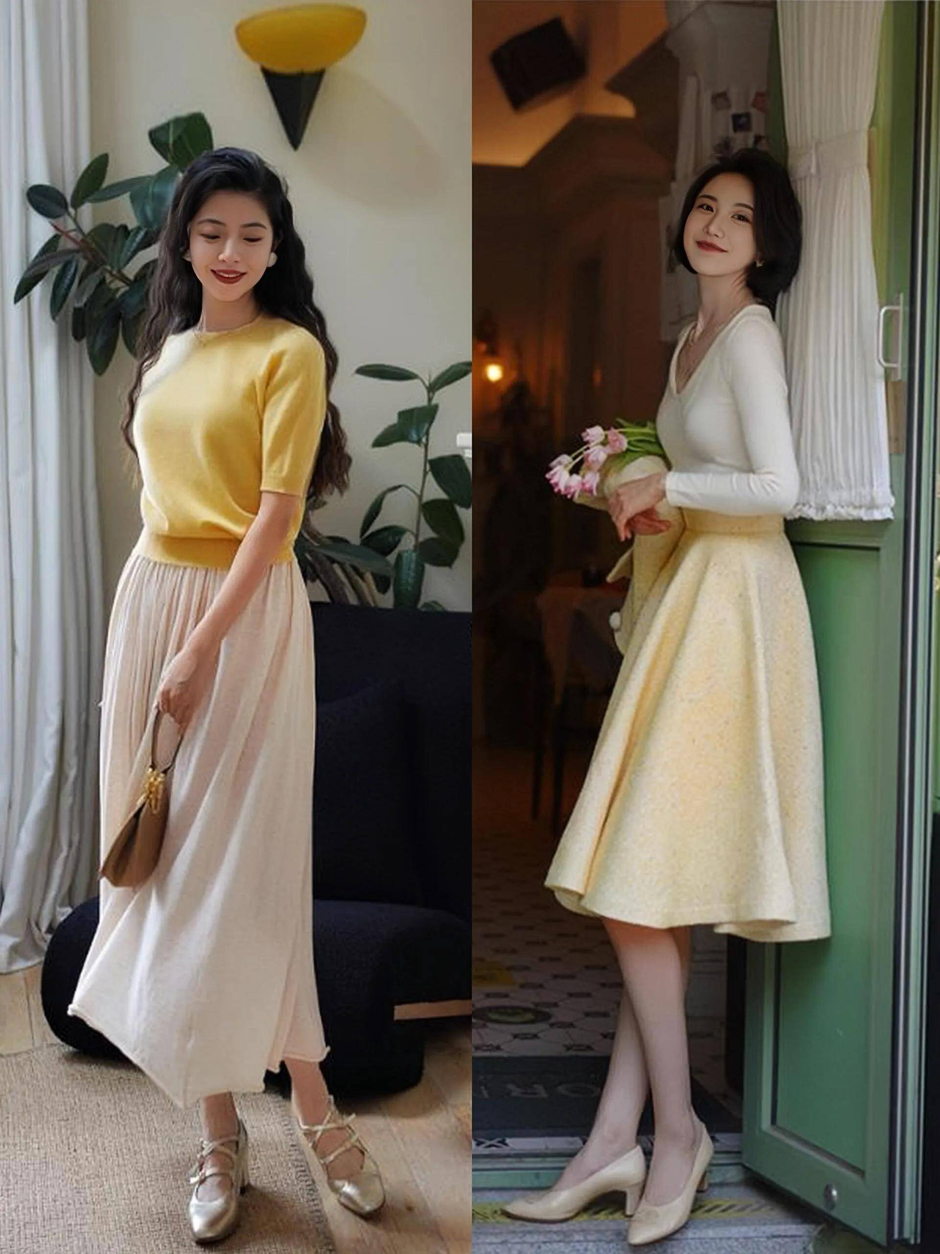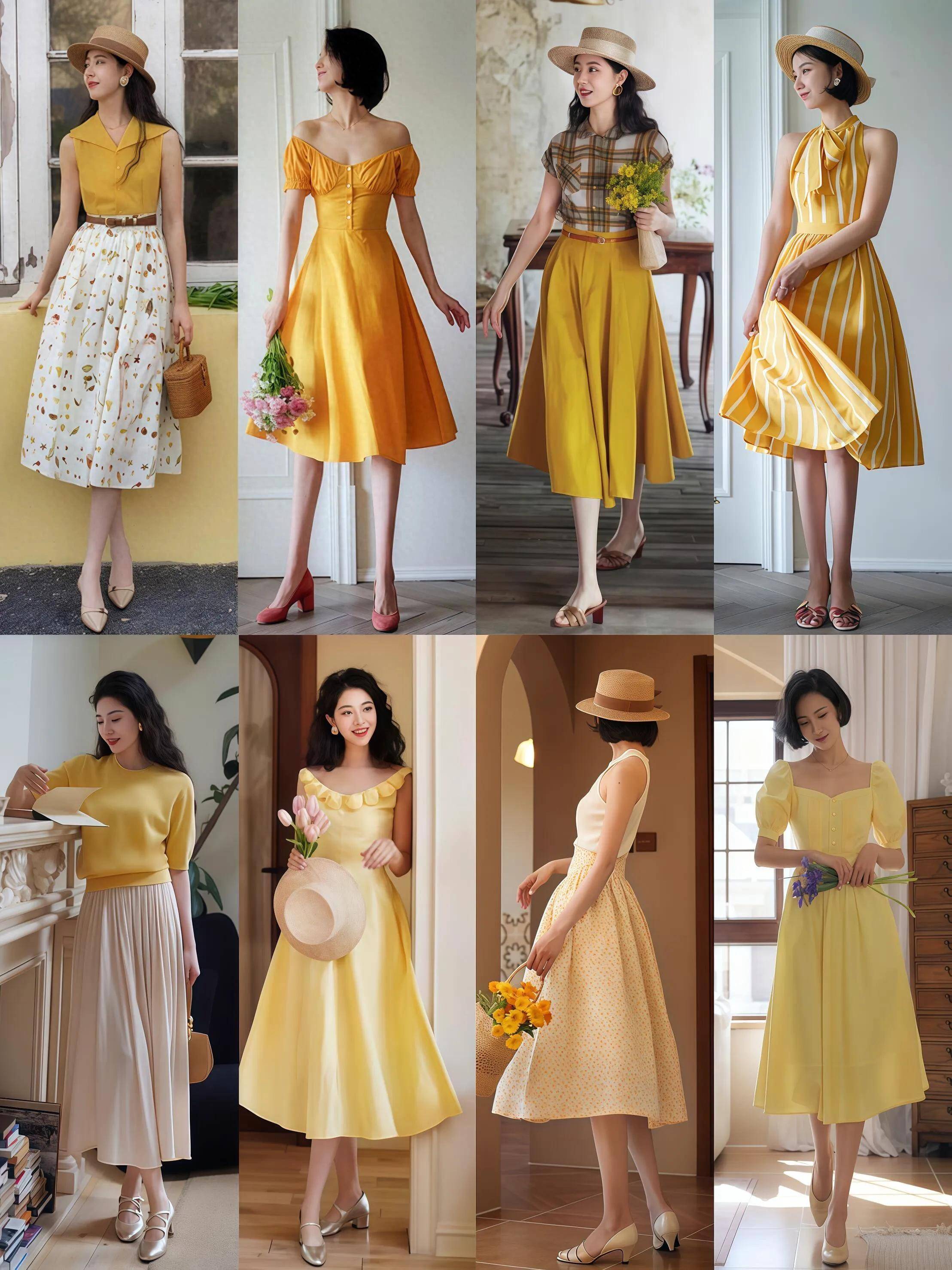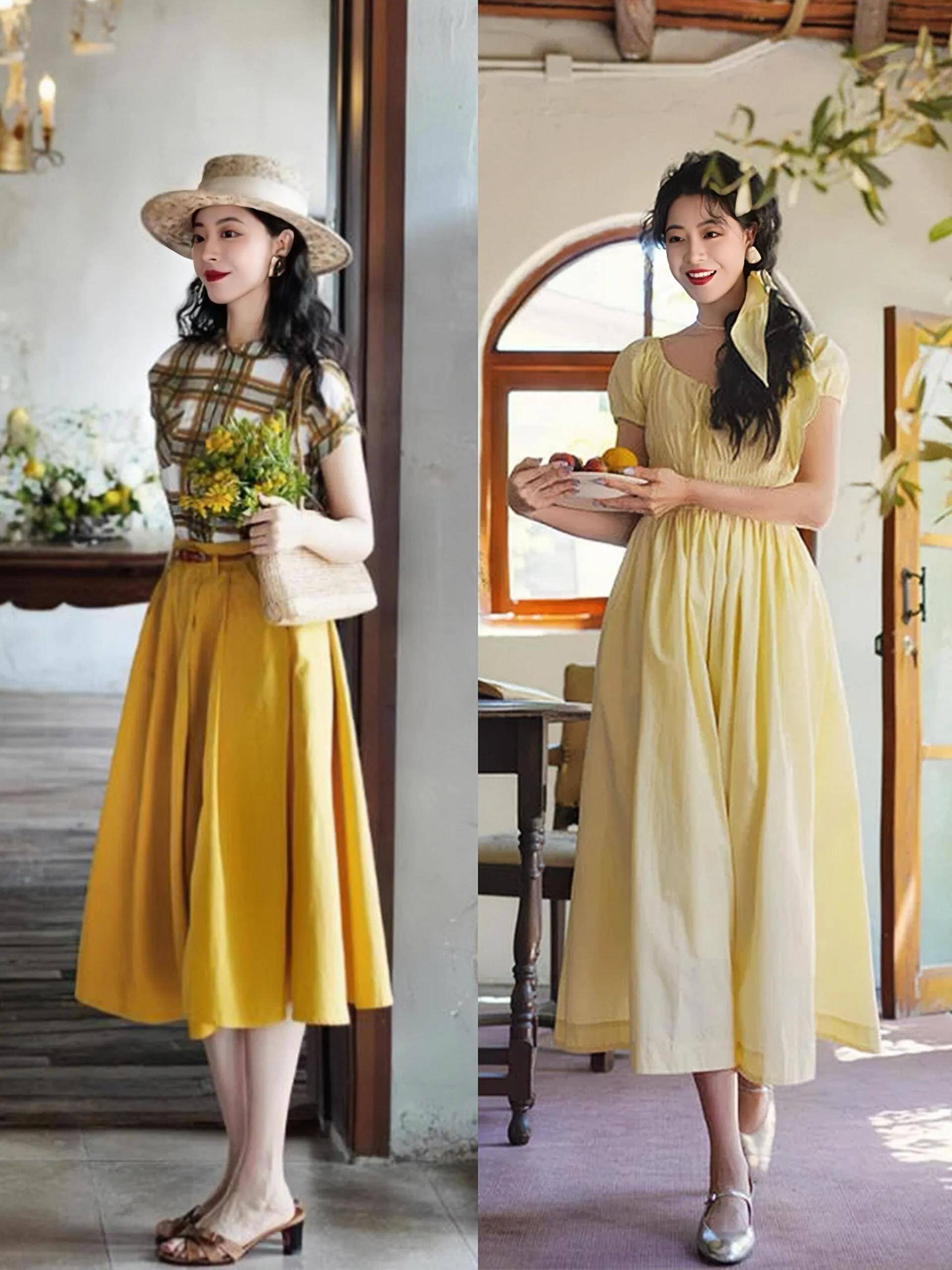 法式复古风的颜色从不是单调的“旧”,而是像被阳光晒过的油画——明晃晃的黄色系是绝对的“氛围担当”:黄色小翻领上衣配印花半身裙,再戴一顶草帽,像刚从法国街头的咖啡馆走出来,连风都带着度假的甜;露肩黄色连衣裙裹着复古剪裁,配红色高跟鞋,明艳得像夏日里的玫瑰,不管是派对还是约会,都能成为焦点。还有草绿色格子、黄底碎花这些“复古撞色”,既保留了岁月的温柔,又用鲜活的色调戳中人心,一眼就让人记住。