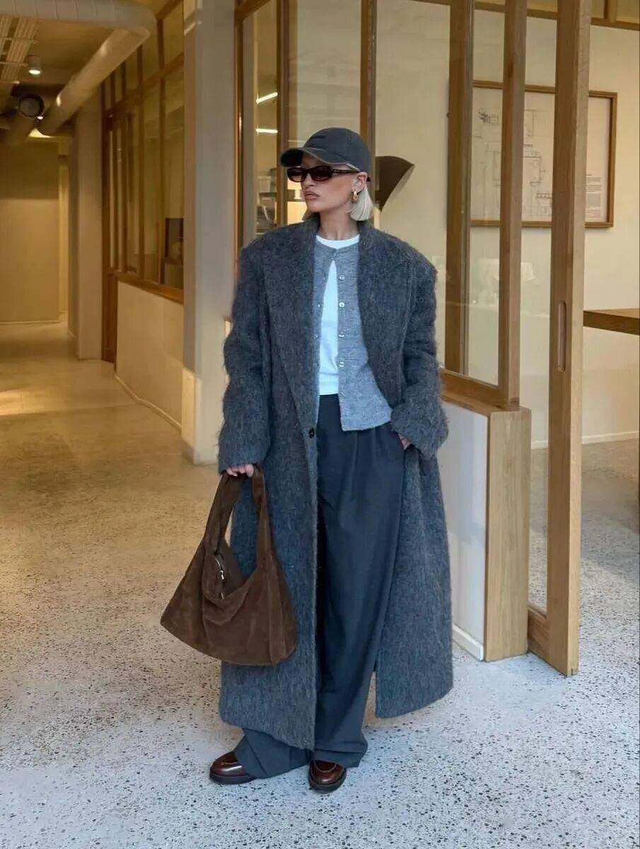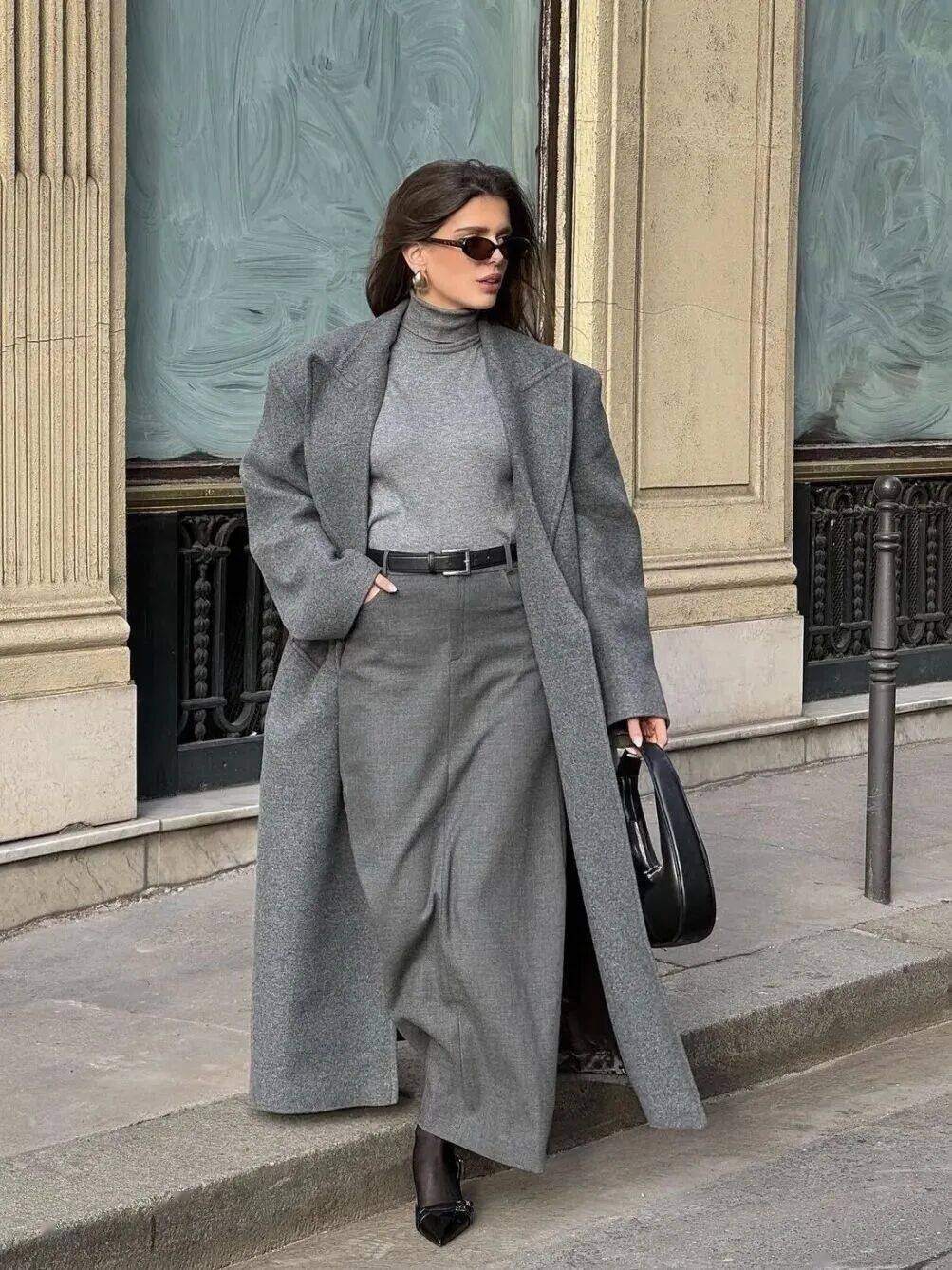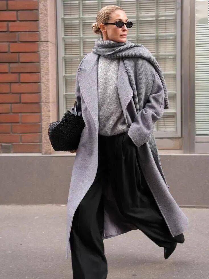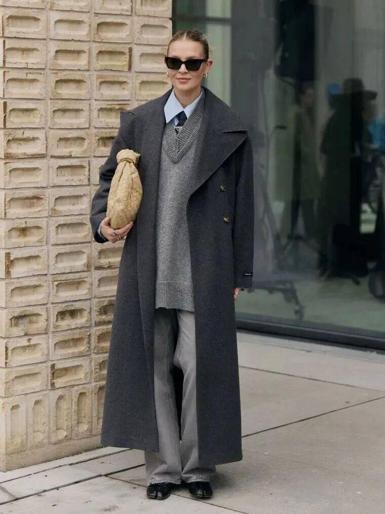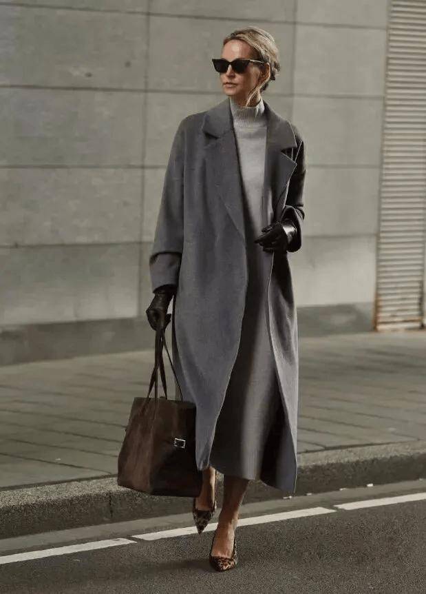 灰色大衣与浅灰针织衫,以细腻的明度渐变铺陈出理性而高级的基底。