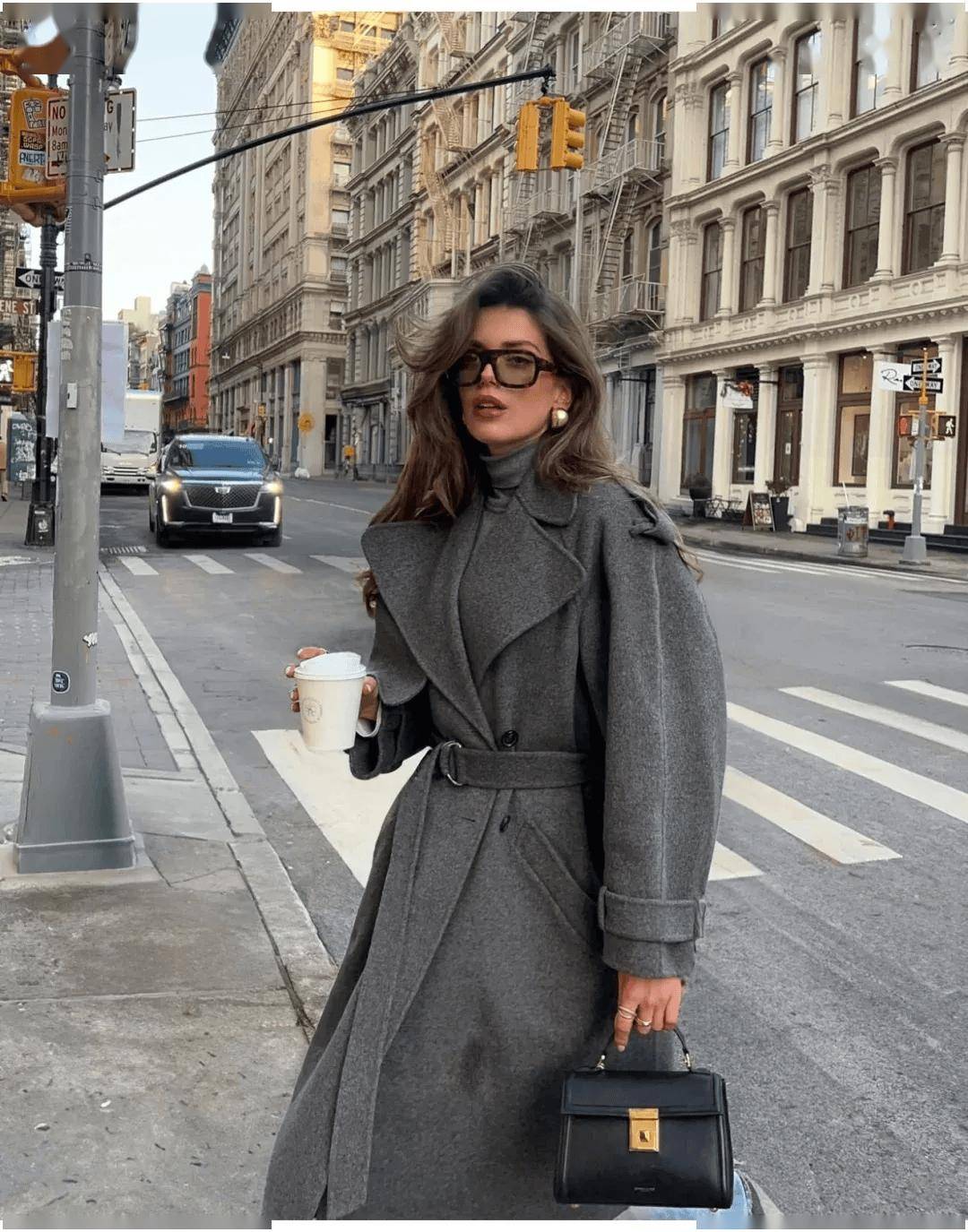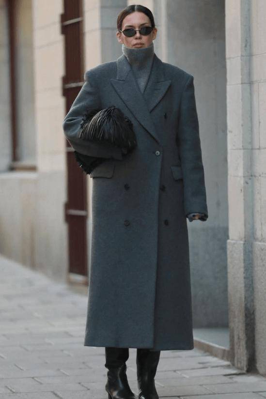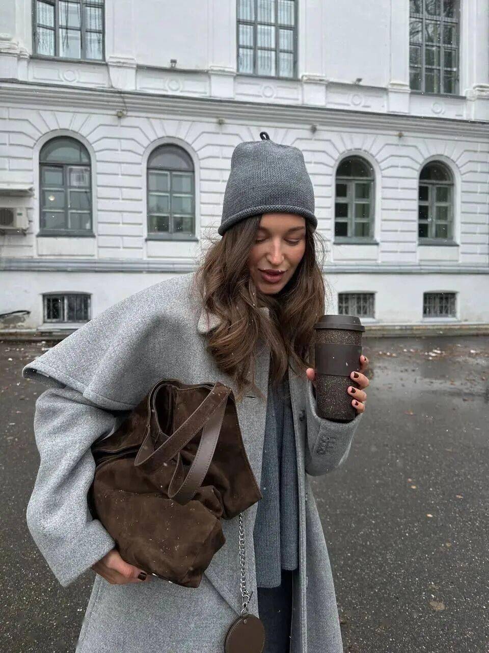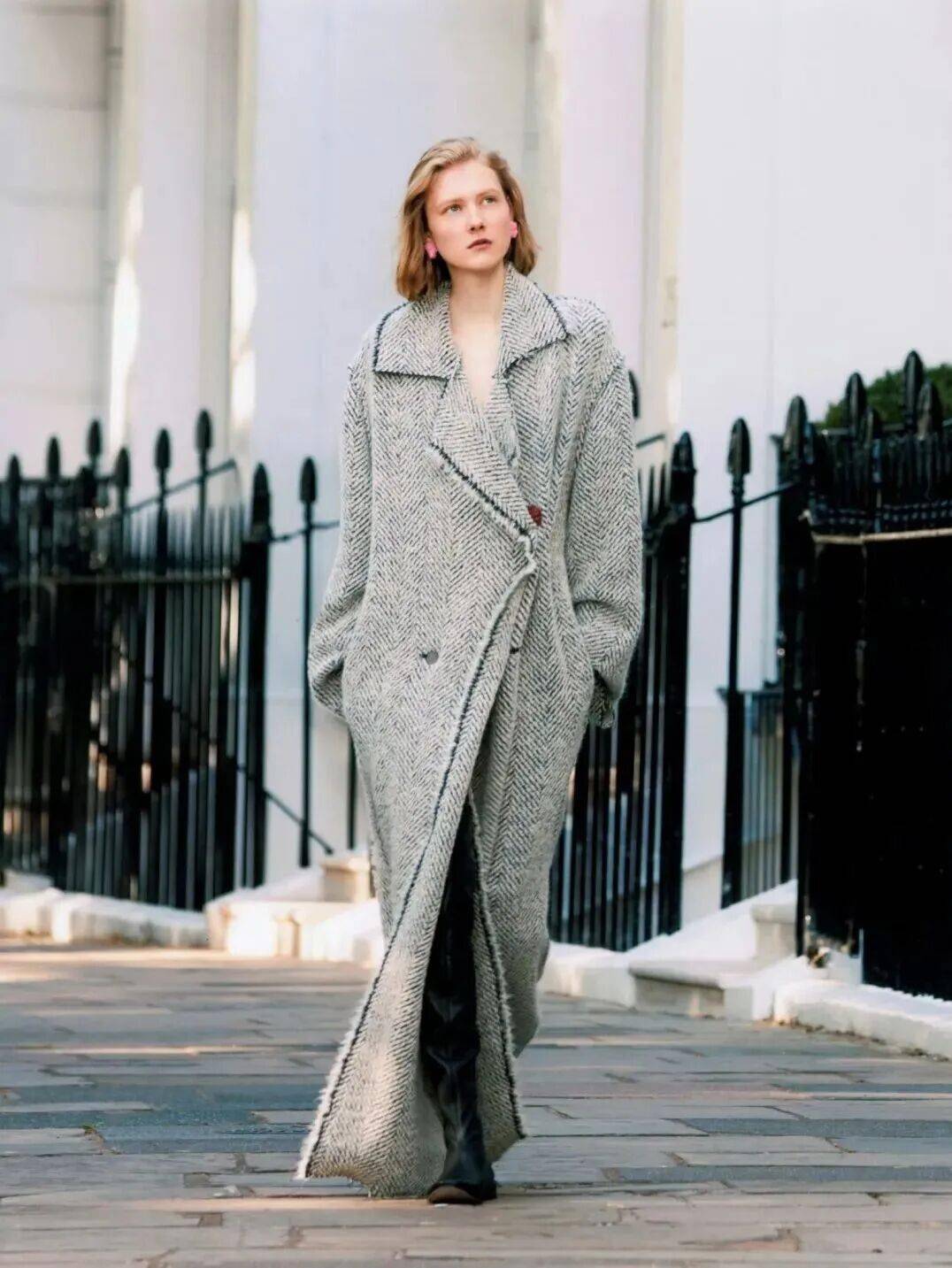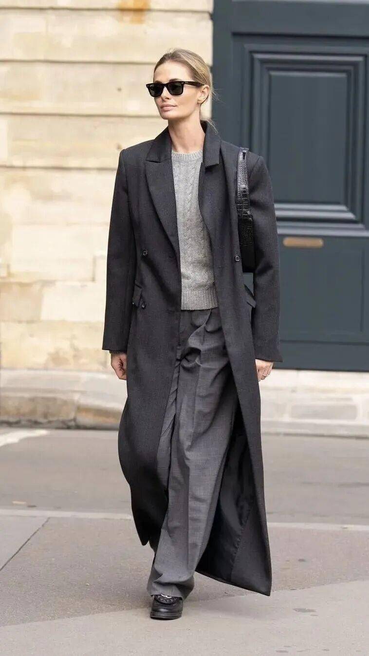 灰色大衣与浅灰针织衫,以细腻的明度渐变铺陈出理性而高级的基底。