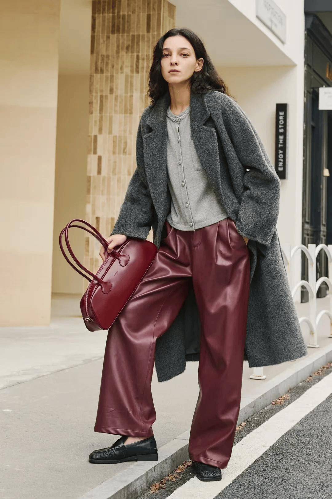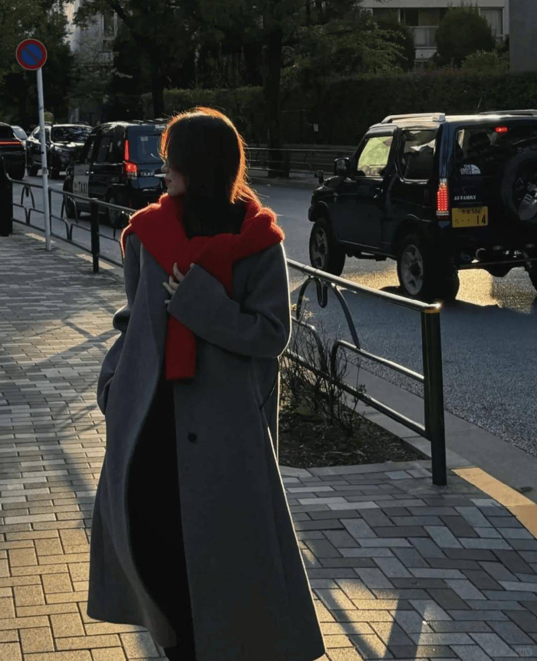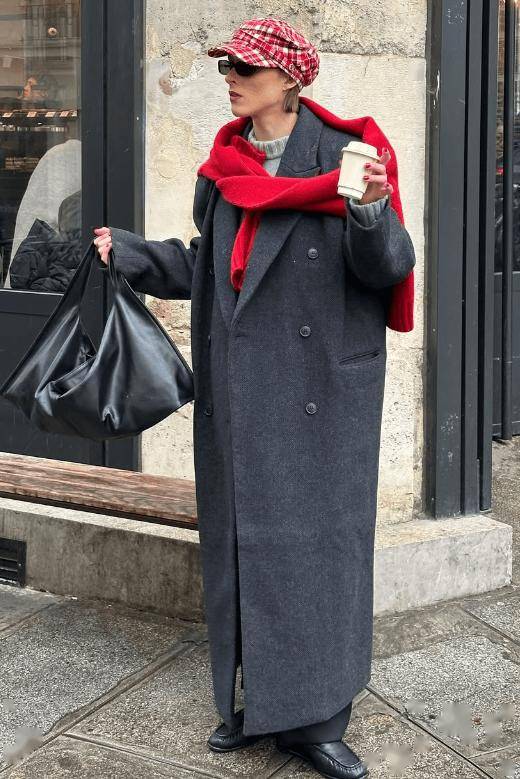 红色配饰遵循「黄金三角法则」:面积控制在15%以内,位置聚焦于领口、手腕或包袋。深灰双面呢大衣内搭酒红色高领毛衣,金属扣腰带与勃肯鞋形成纵向延伸,既保留灰调的克制感,又以酒红作为视觉锚点激活整体造型。