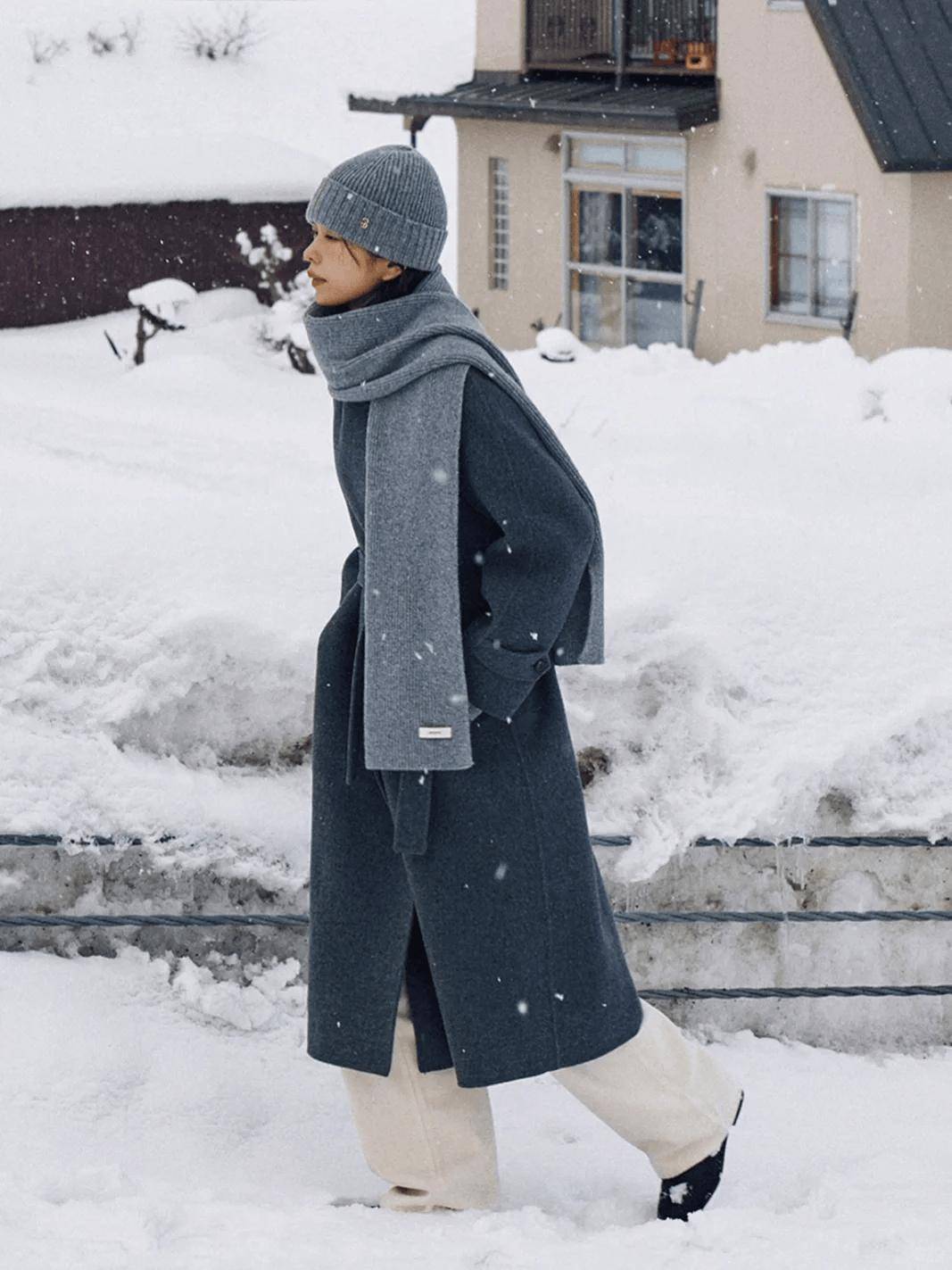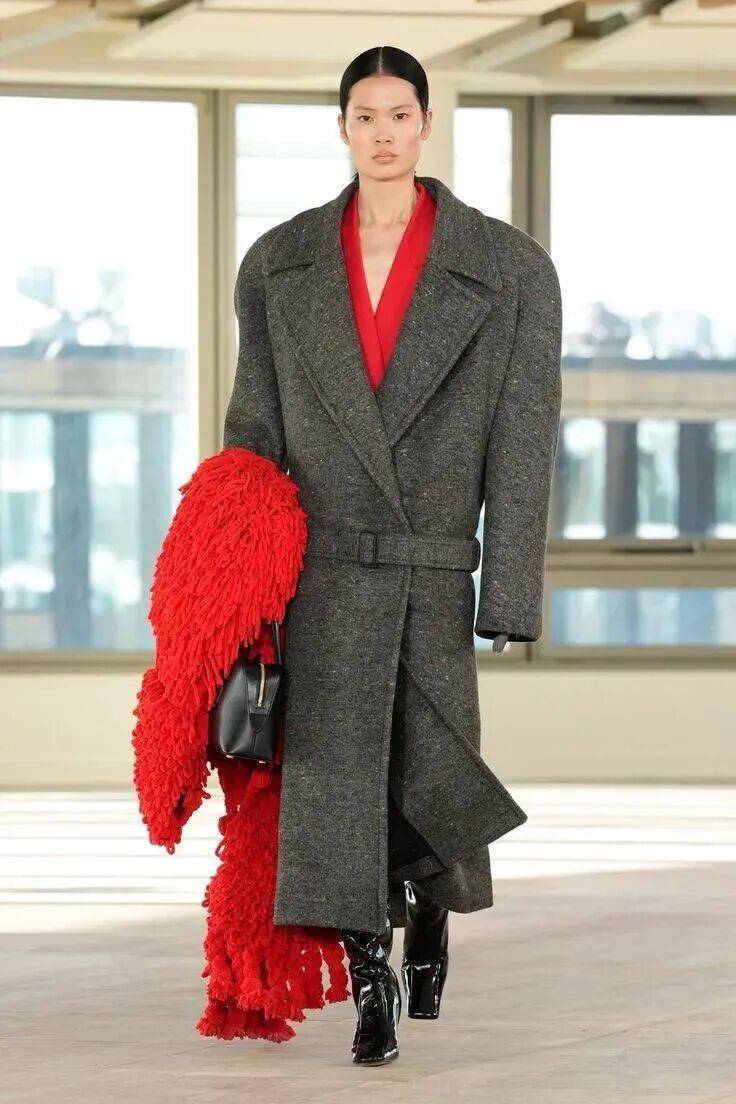 灰色大衣+灰色毛衣+灰色围巾的组合,下身可以配一条黑色\白色阔腿裤,整体简约至极,充满耐人寻味的细节力量。