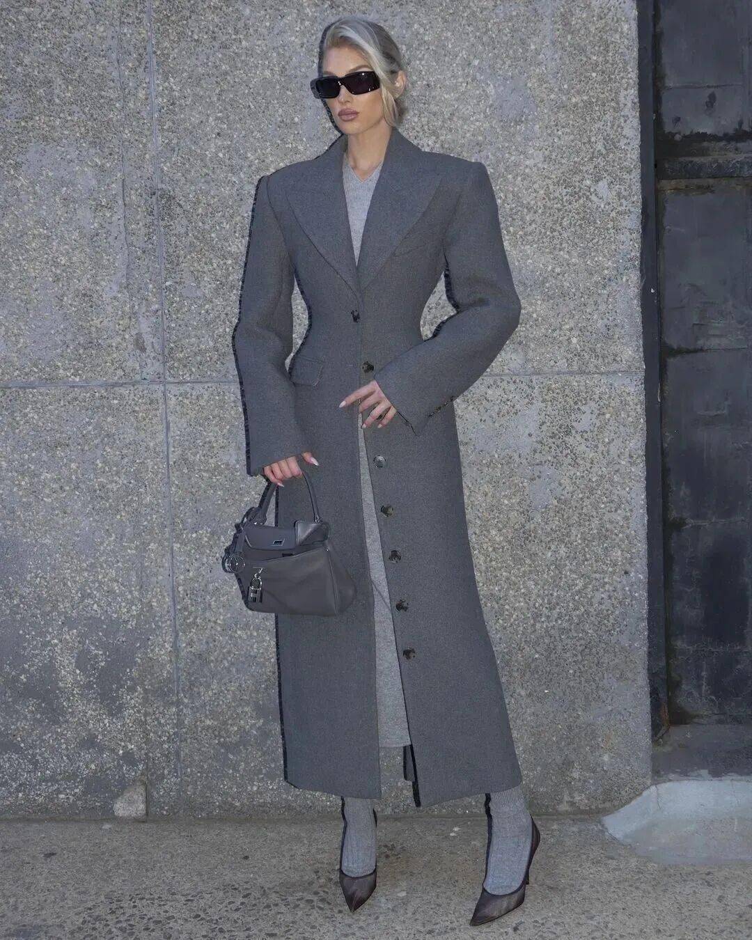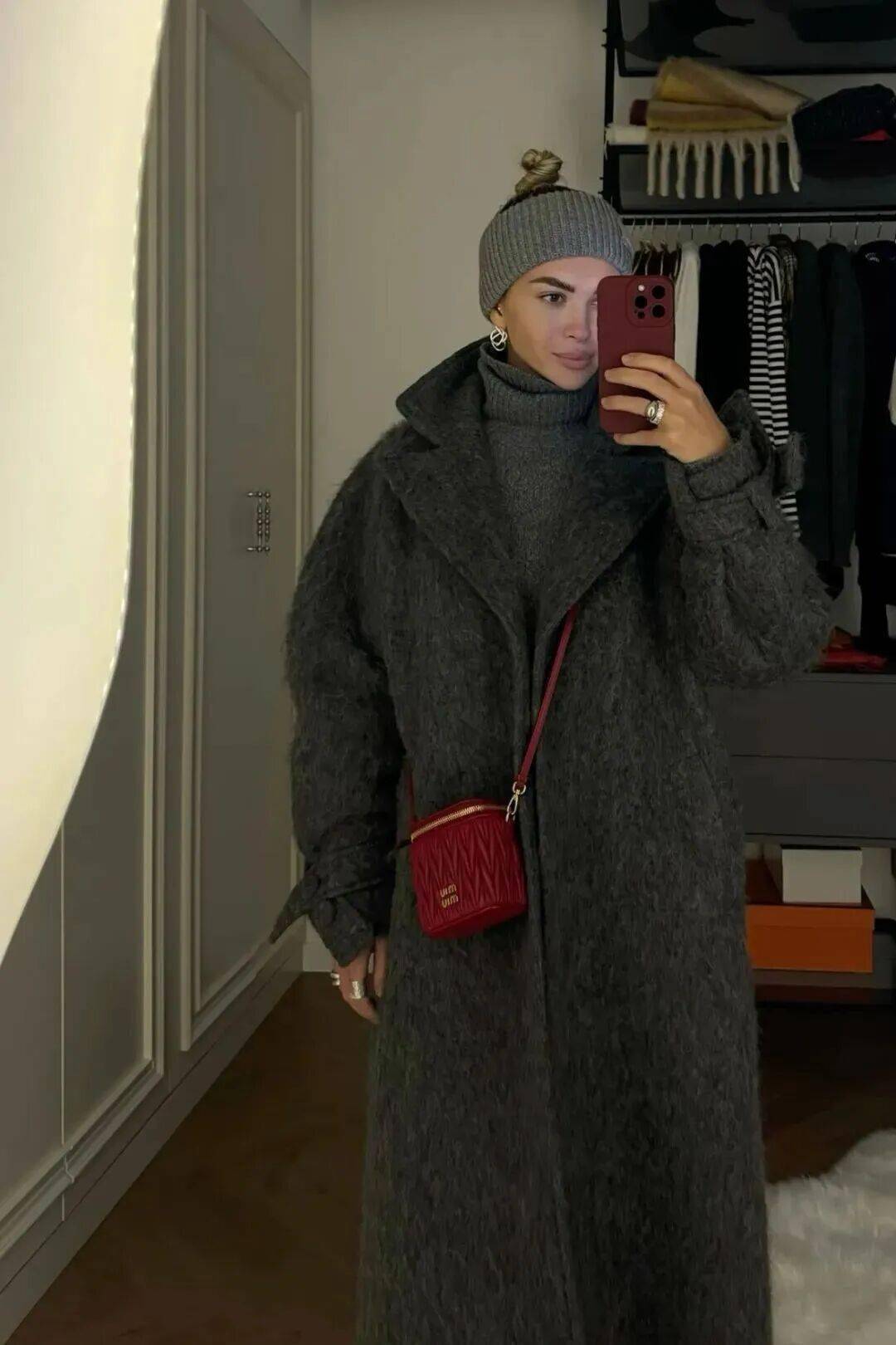 灰色大衣的魔力始于其建筑感剪裁。H型廓形以垂直线条重构身形比例,通过利落垂坠感延伸视觉高度,赋予穿着者冷静疏离的智性气质,堪称通勤场景的黄金法则。