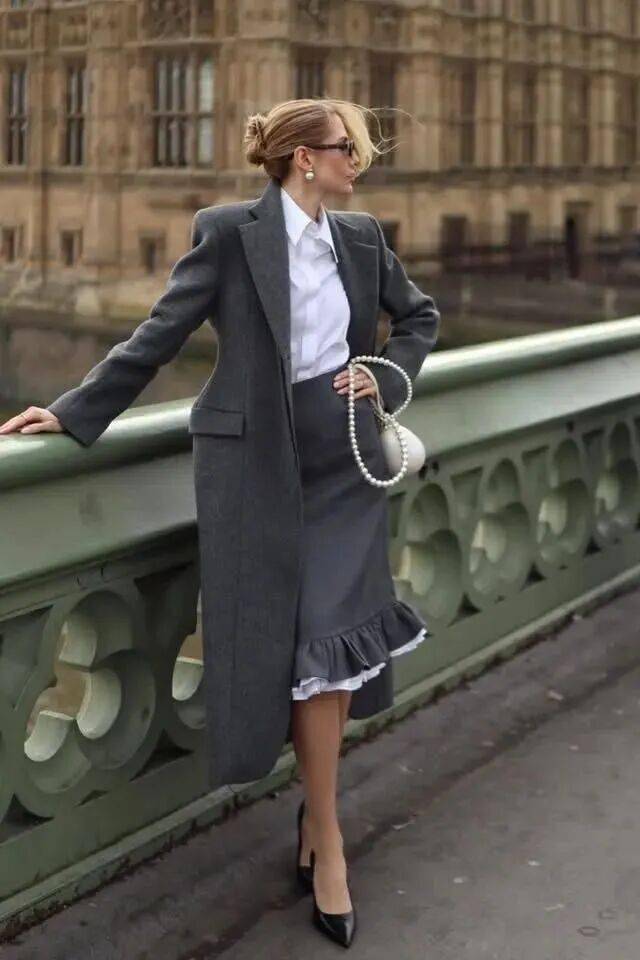 通勤场景:深灰H型大衣+同色半裙+白衬衫,通过「少色原则」保持专业感,金属细腰带与尖头踝靴强化利落气场。