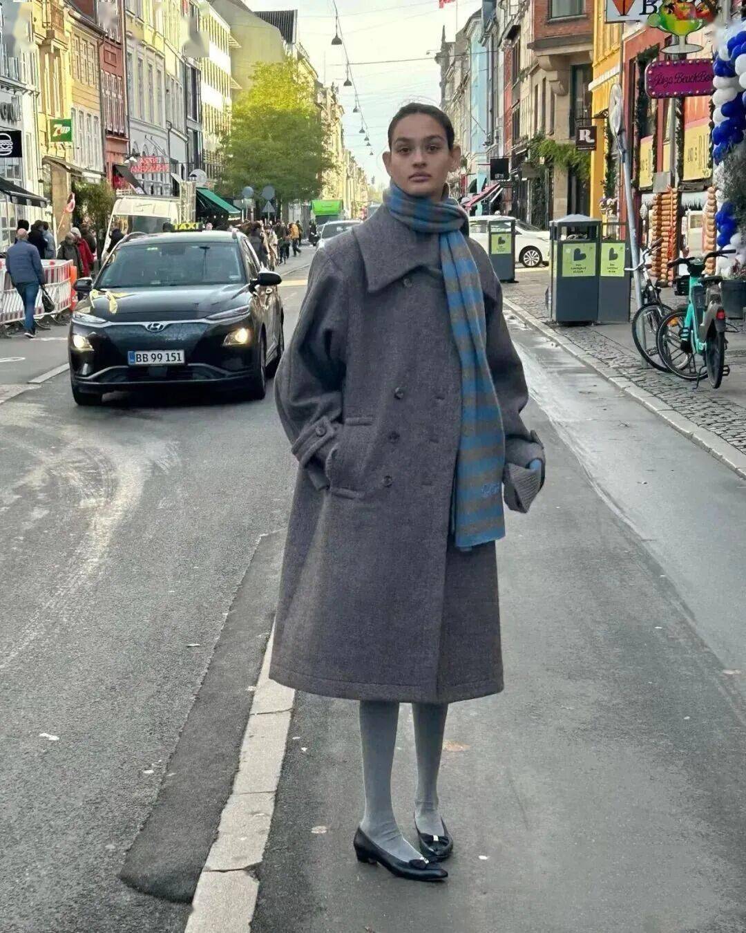 给灰色大衣系一条蓝灰交织的围巾,它打破了纯灰的沉静,却又未曾扰乱那份高级的基调,反而增添了几分朦胧的层次与流动的呼吸感。