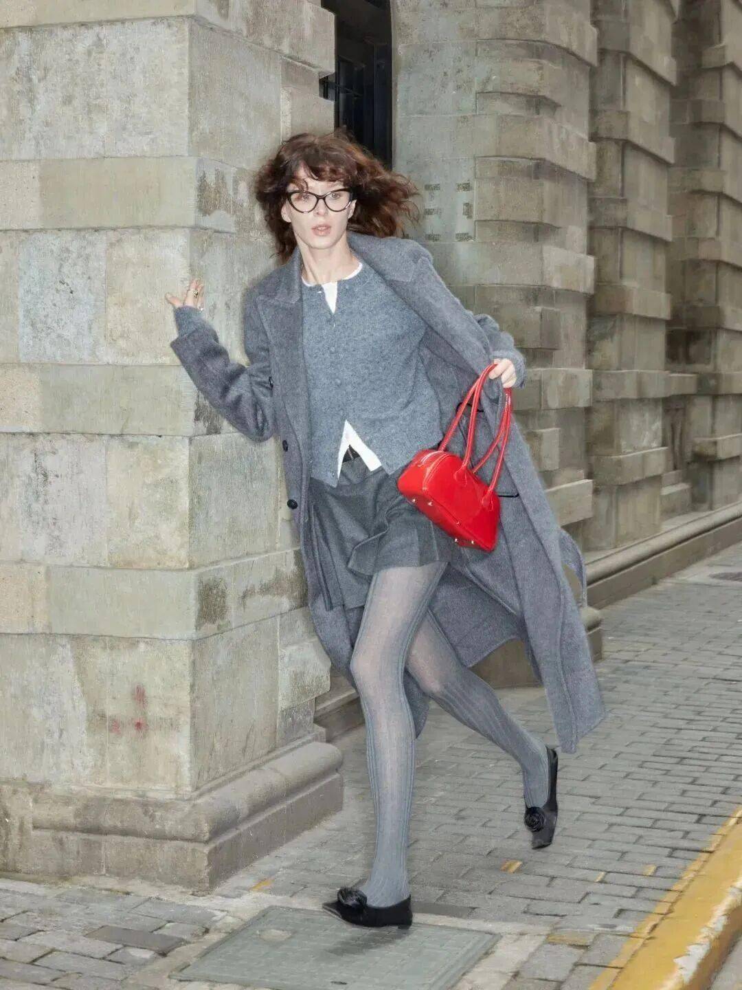 穿灰色大衣配灰色毛衣时,拎一个大红色包包,让整体更明亮,不会显得沉闷。