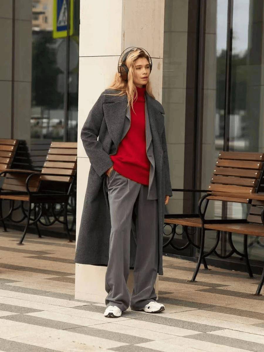 灰色+红色:热情时尚,像“冬日的火”。比如中灰色大衣内搭红色高领毛衣,下搭黑色紧身裤,再踩一双红色短靴,用“小面积红”点亮整体,避免过于夸张;