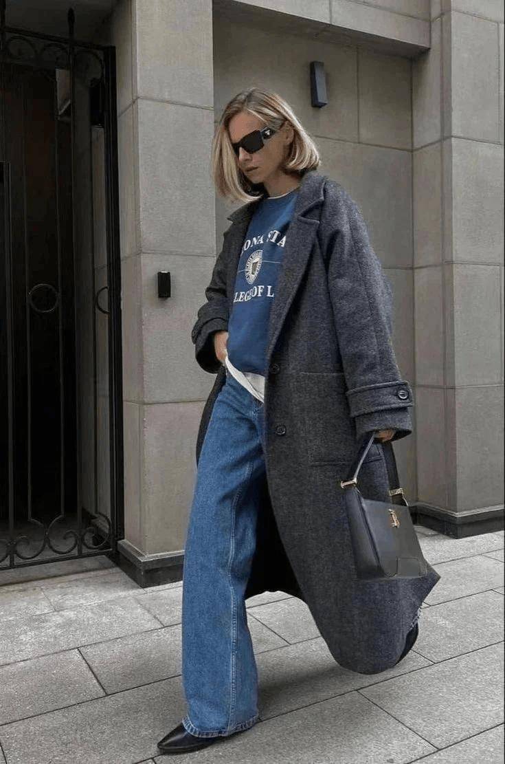 灰色+浅蓝色:清新干净,像“夏日的天空”。比如深灰色大衣内搭浅蓝色衬衫,下搭白色牛仔裤,再踩一双浅蓝色运动鞋,适合春天或秋天的通勤。
