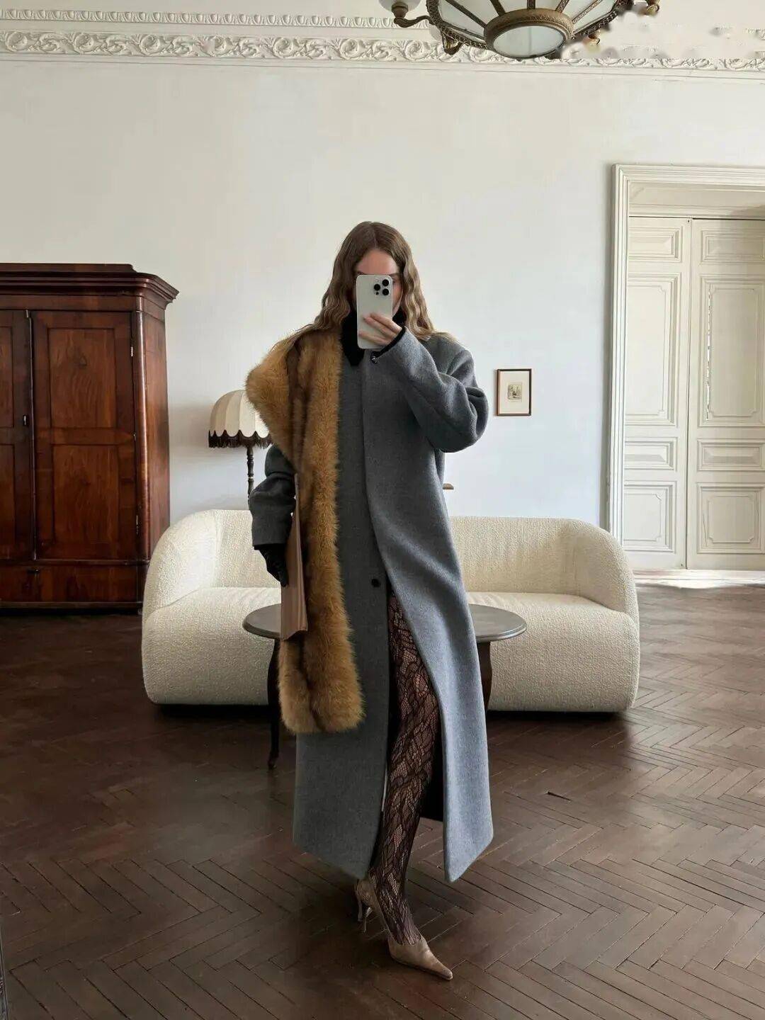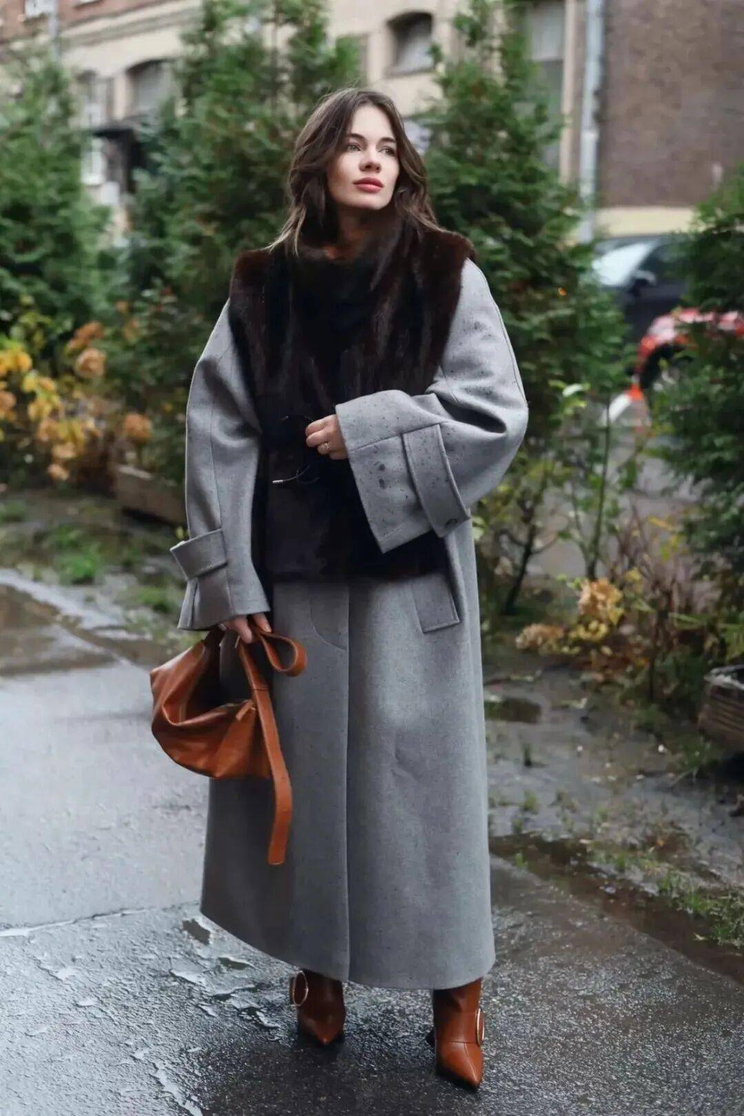 给灰色廓形长大衣配一条棕色皮草围巾,层次自然出现。