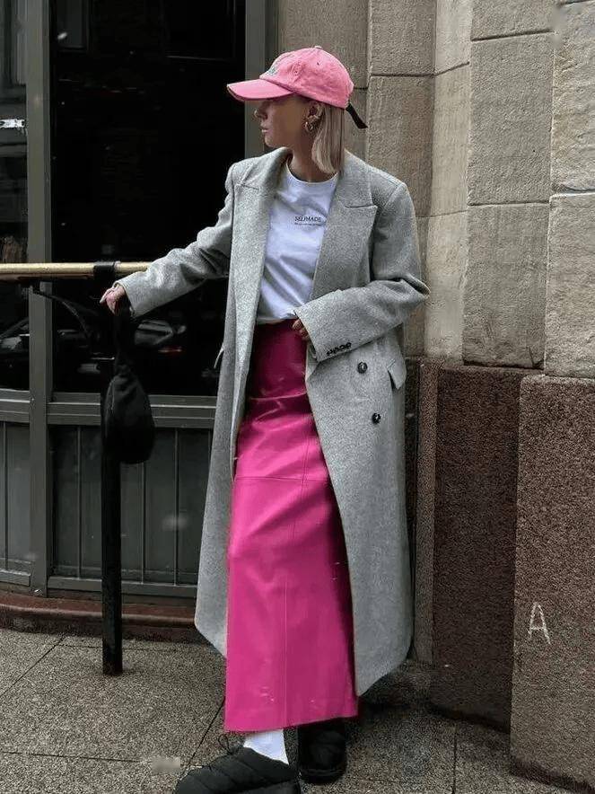 灰色+浅粉色:浪漫柔和,像“春日的樱花”。比如浅灰色大衣内搭浅粉色针织连衣裙,下搭裸色短靴,再戴一顶浅粉色贝雷帽,瞬间变成“甜妹”;