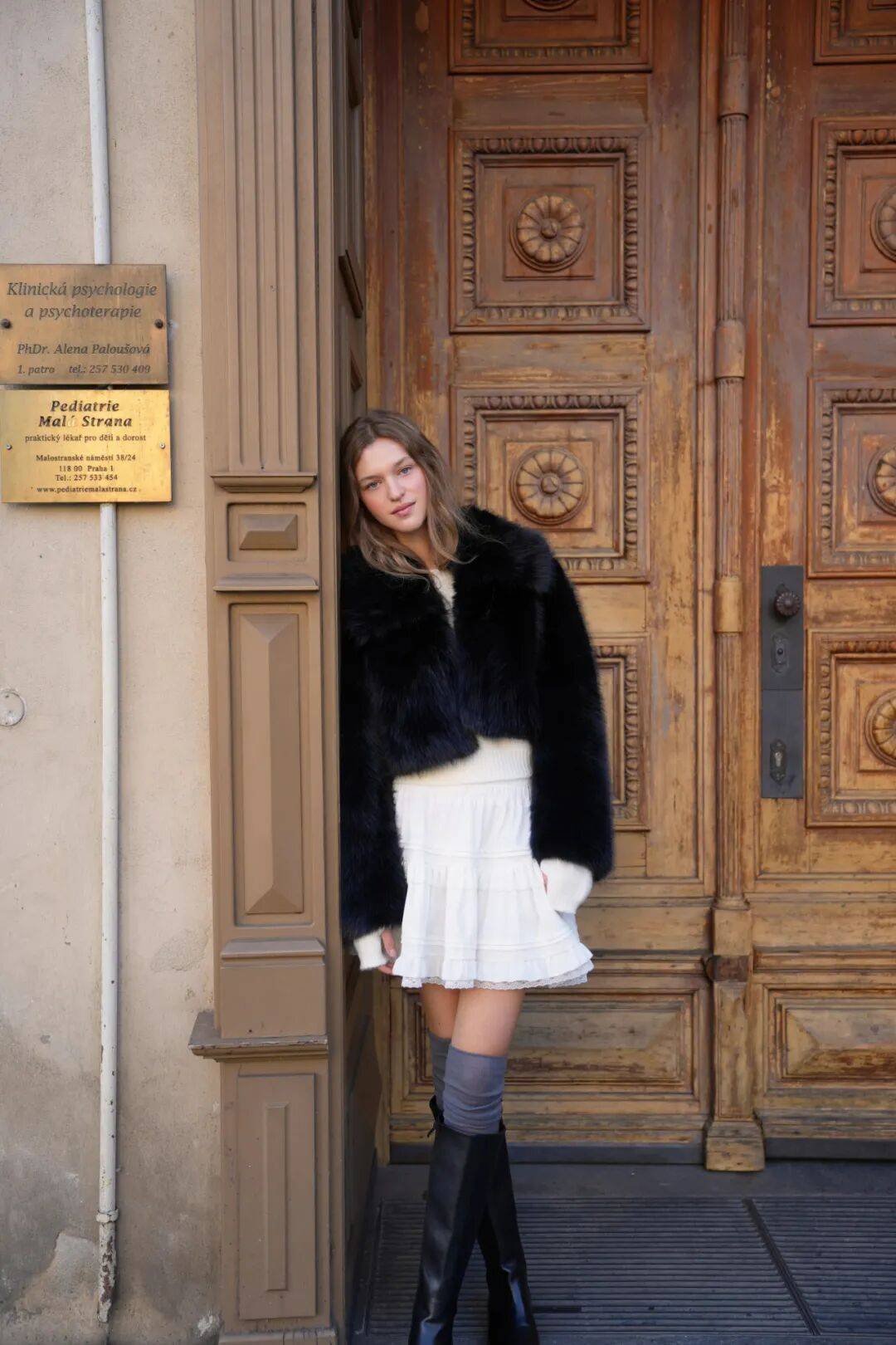 短裙/短款羽绒服:选及膝高筒袜(长度到膝盖下方),护住膝盖的同时,显腿直显细,搭马丁靴就是“甜酷少女”,搭乐福鞋则是“法式慵懒”。
