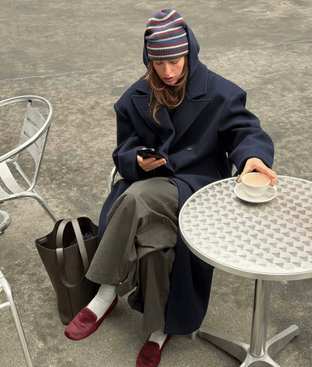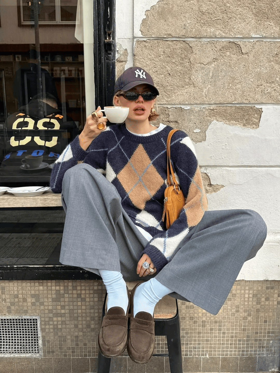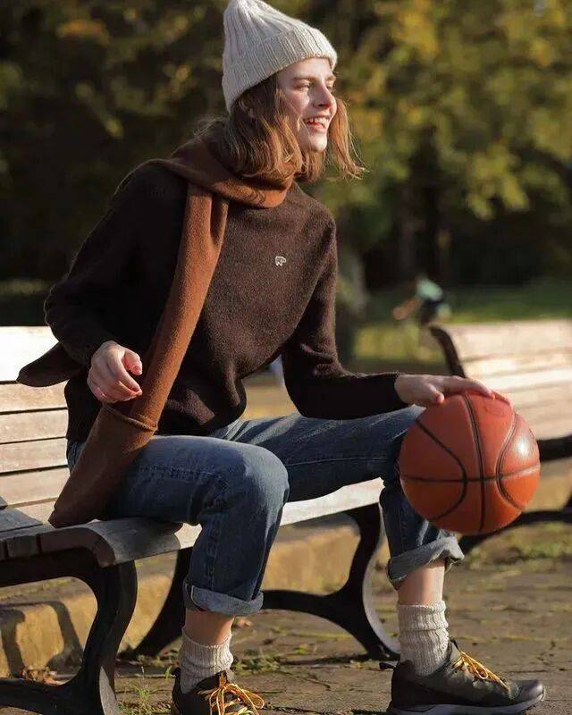 束脚运动裤:将短袜塞在裤脚里(如藏蓝色束脚裤配米白色短袜),既不臃肿,又能藏住脚踝,搭oversize卫衣,秒变“刚下课的大学生”;