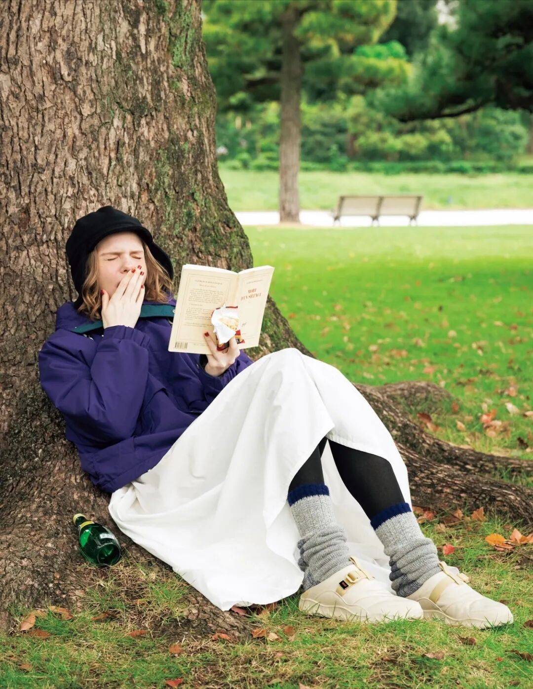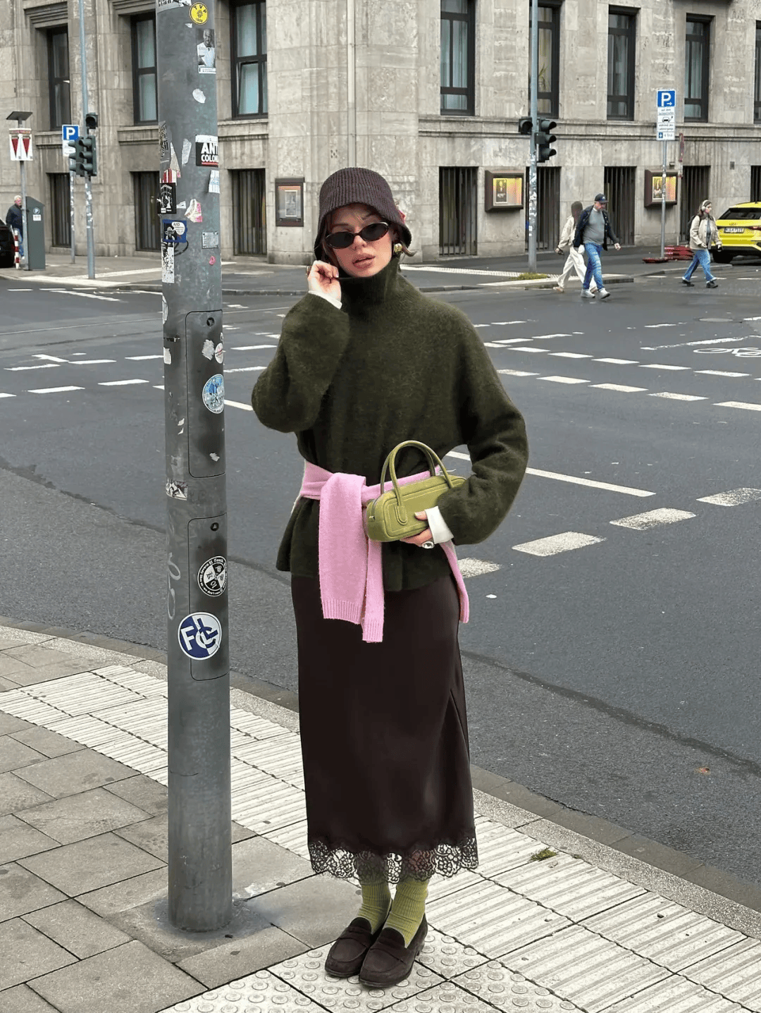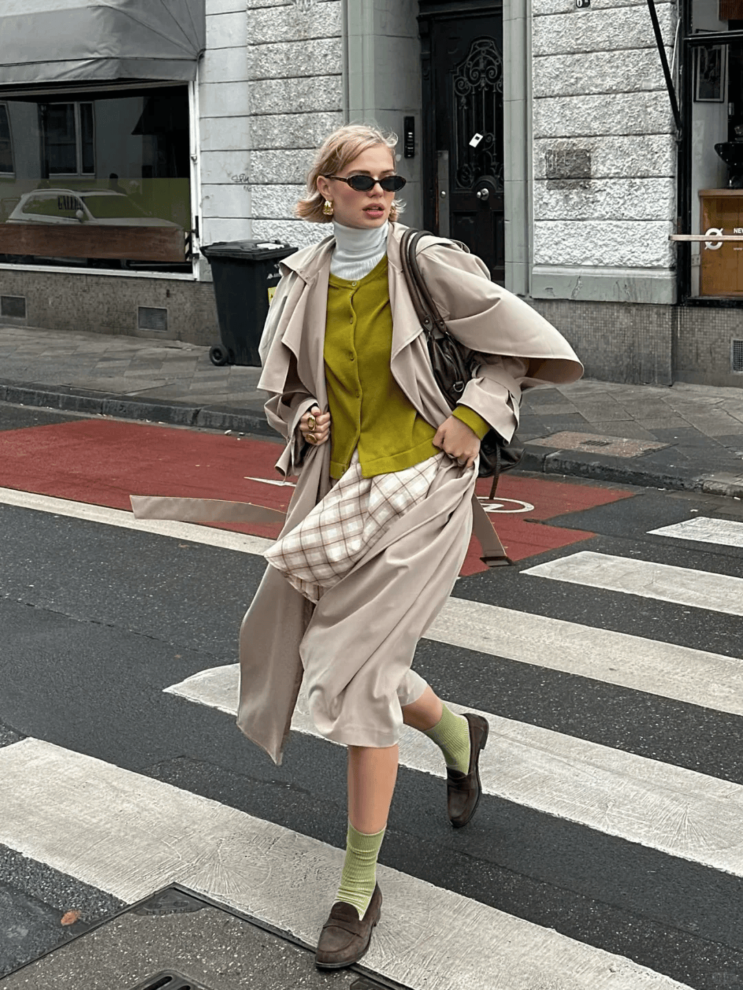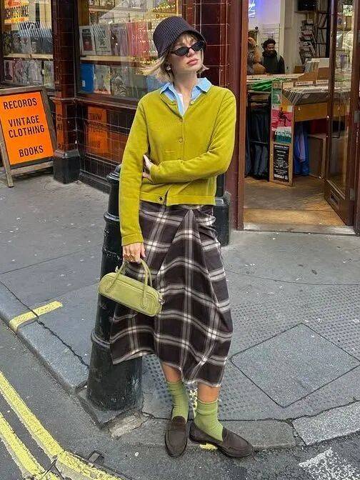 高腰长裙+短袜:墨绿高腰伞裙+浅灰色短袜+乐福鞋,露一截小腿,腿线条柔和,法式慵懒;
