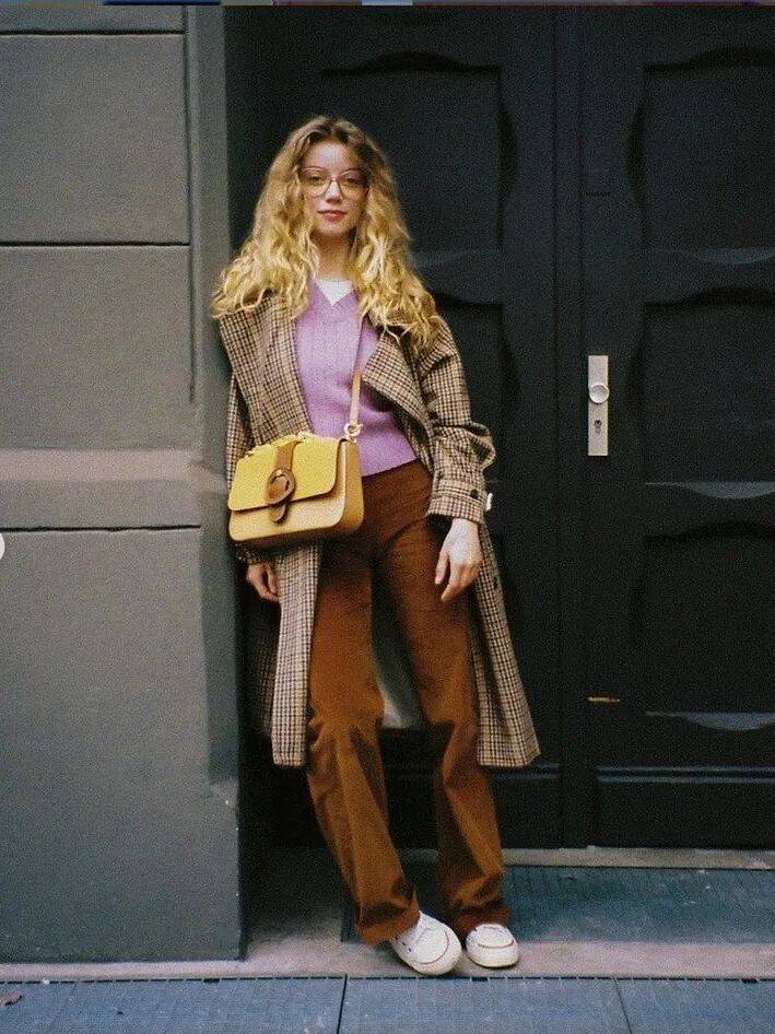 亮眼组合:灰西装+鹅黄色直筒裤;