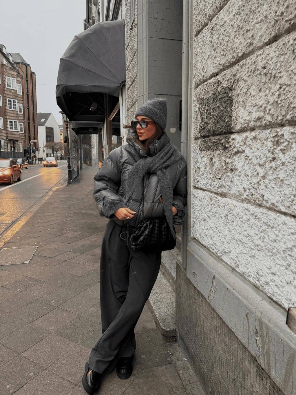 深色阔腿裤+浅色长款羽绒服,自带显瘦buff;