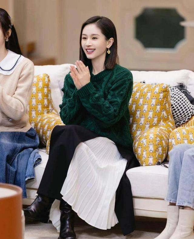 墨绿色的粗针织毛衣,搭配不规则剪裁的半身裙,黑白拼色的设计,耐看又高级。