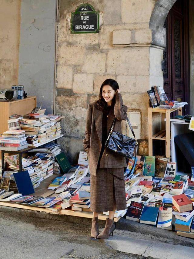 格纹图案的西装套裙,配双同色系的尖头低跟踝靴,复古又有女人味。