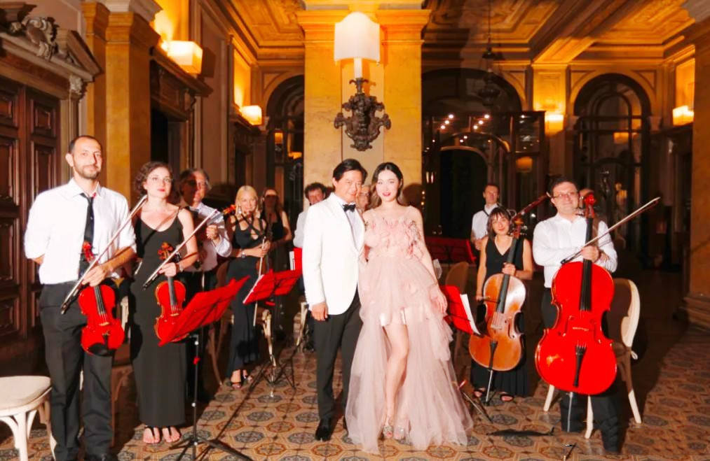 王冰冰在镜头前的穿搭尤为亮眼,从意大利婚礼的中西合璧婚纱到日常的意式潮装,每一套造型都诉说着华裔艺术家的文化认同与时尚表达。