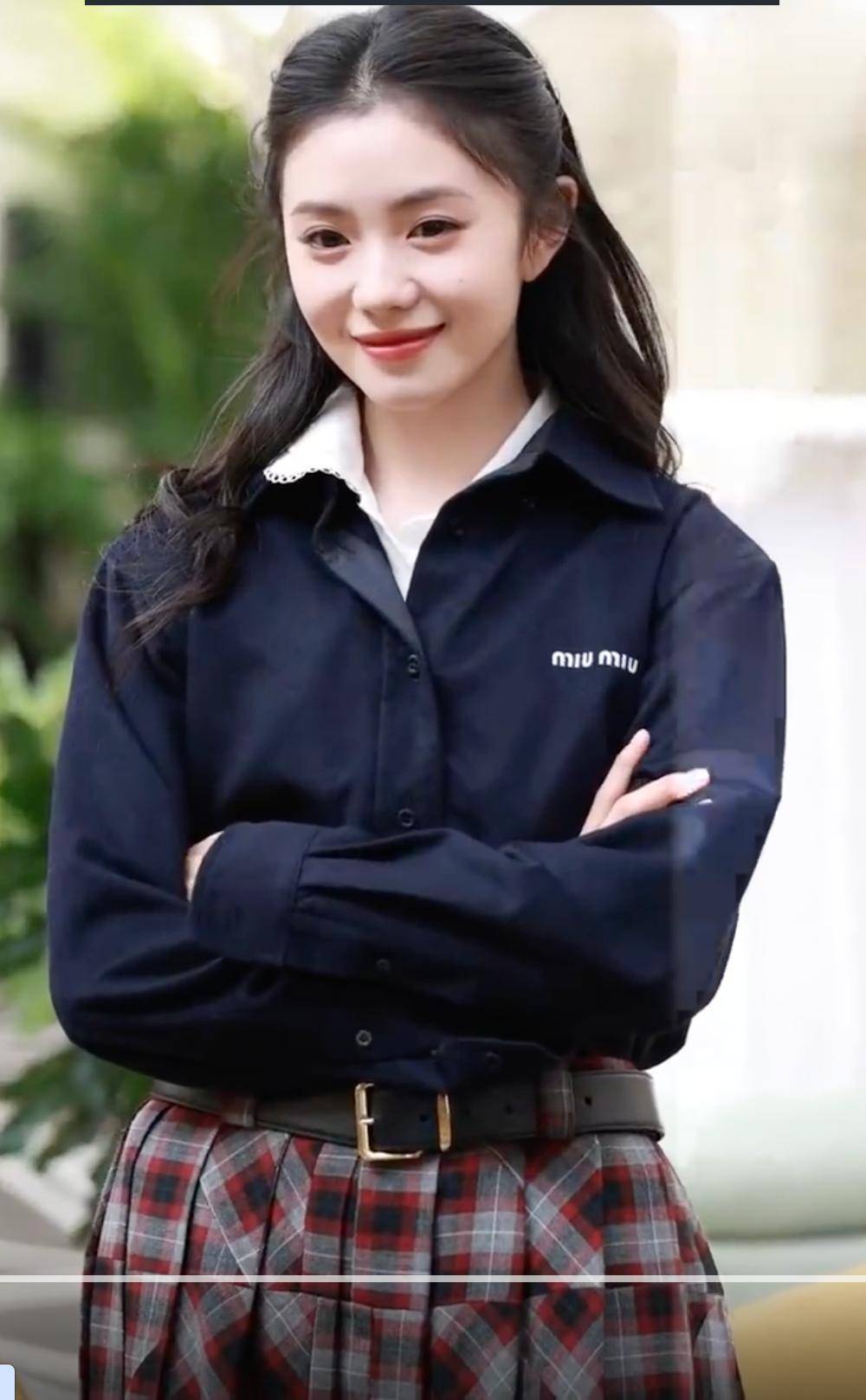 首先登场的是刘浩存。她以一身学院风装扮惊艳亮相:白色衬衣外搭蓝色针织衫,配以红色格纹短裙,脚踩黑色乐福鞋,半扎公主头更添俏皮,整体造型宛若从漫画中走出的少女。