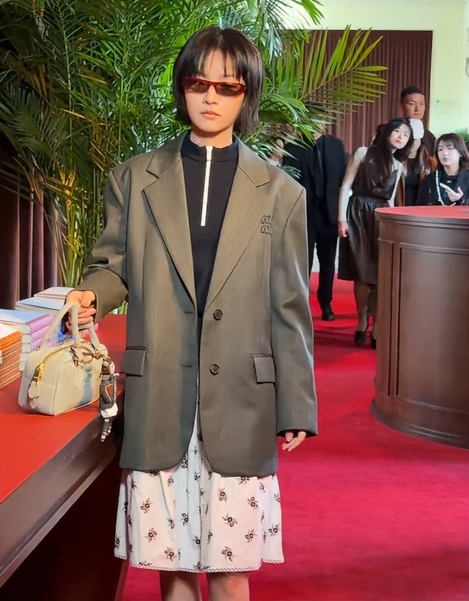 灰色西装外套搭配拉链内衬,下身着白色长裙与黑色长靴,既显酷飒又不失甜美。与上月VOGUE盛典上被指“显老十岁”的咖啡色吊带裙造型相比,简直判若两人。