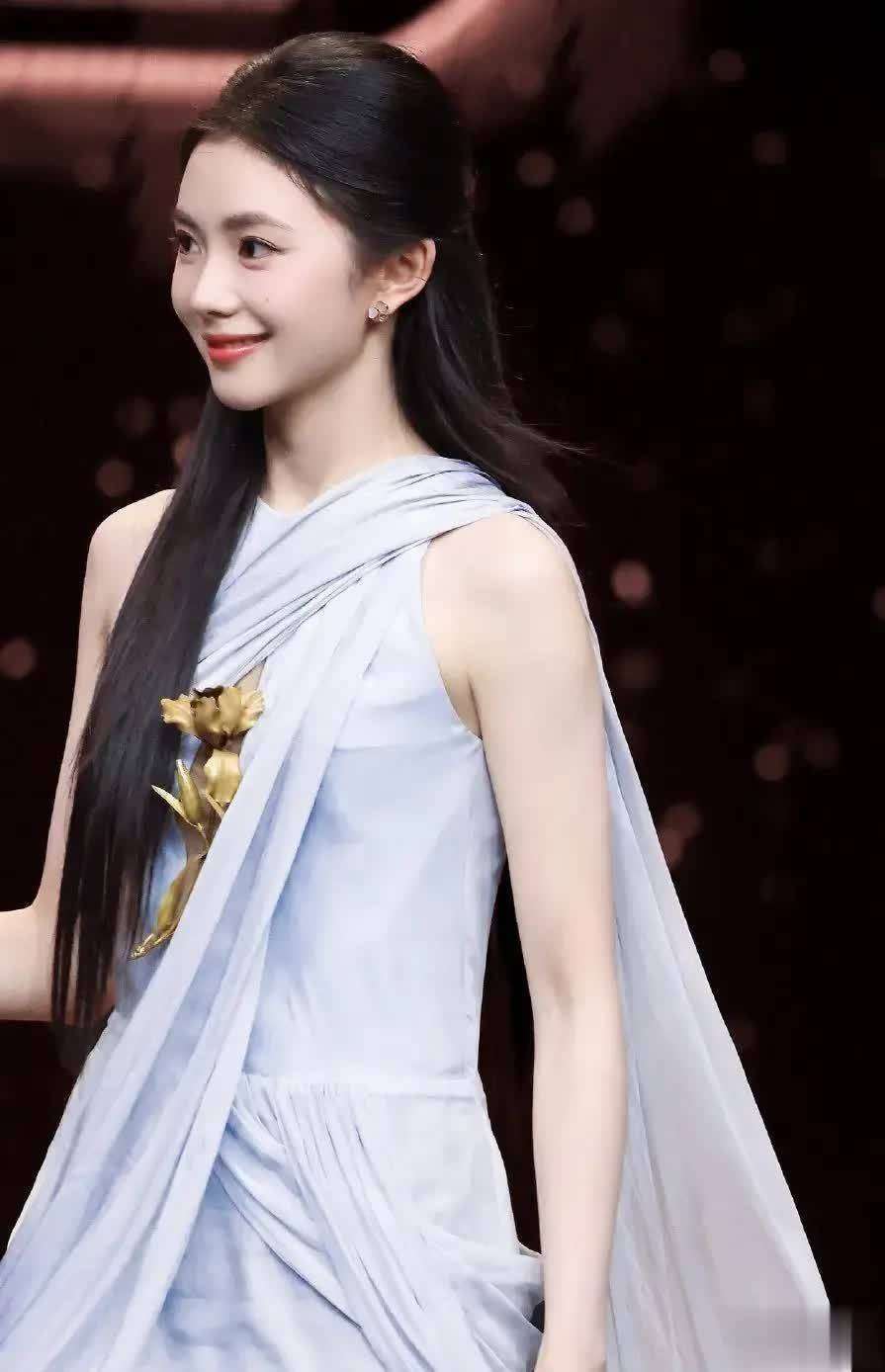 这套服装的设计不仅独具匠心,细节之处更显匠心独运。裙面上细密的珠片刺绣与亮片相互交织,在灯光的照射下折射出如同星河倾泻般的微光,仿佛将整片夜空佩戴在了她身上。妆容方面,刘浩存选择了极为自然的“原生感”妆容,清透的底妆与浅粉色的唇彩相得益彰,突出了她肌肤的透明感与眼神的清澈灵动。她的配饰极其简约,一对珍珠耳钉点缀其中,整体造型呈现出一种不费力的高级感,彰显了她纯粹的气质。
