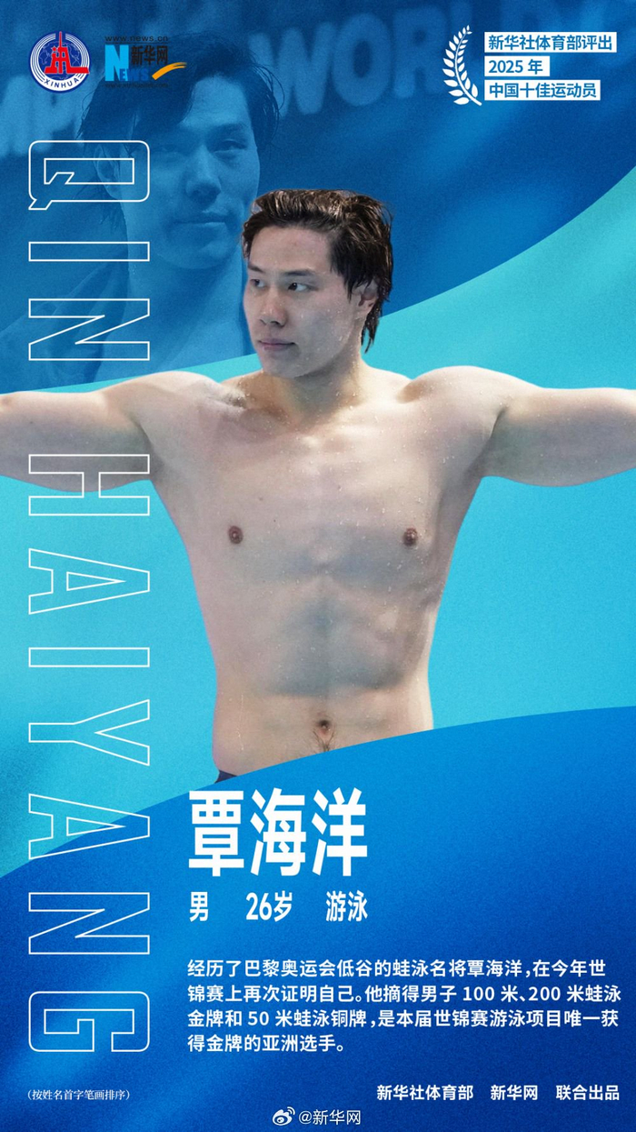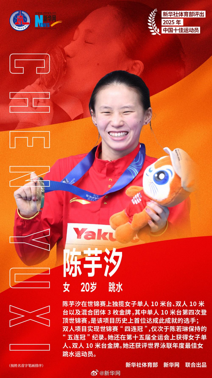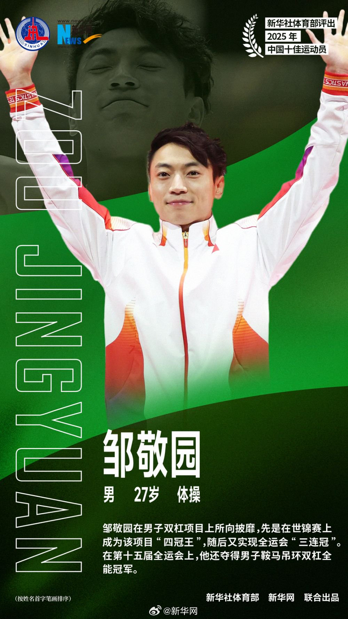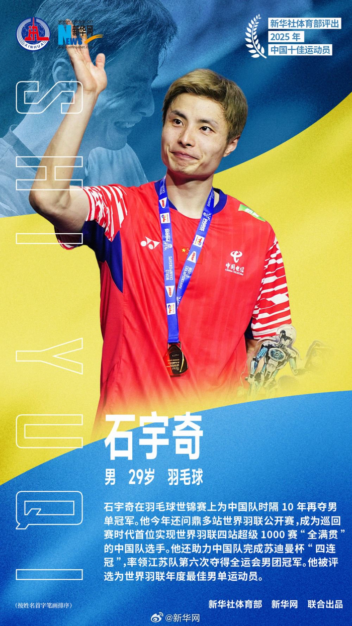 2025年中国十佳运动员##2025我们看见#新华社体育部评出2025年中国十佳运动员如下(按姓名首字笔画排序): 1、石宇奇(男,29岁,羽毛球) 石宇奇在羽毛球世锦赛上为中国队时隔10年再夺男单冠军。他今年还问鼎多站世界羽联公开赛,成为巡回赛时代首位实现世界羽联四站超级1000赛“全满贯”的中国队选手。他还助力中国队完成苏迪曼杯“四连冠”,率领江苏队第六次夺得全运会男团冠军。他被评选为世界羽联年度最佳男单运动员。 2、巩立姣(女,36岁,田径) 在第十五届全运会女子铅球决赛中,巩立姣克服伤病困扰,实现了中国田径史无前例的全运会“五连冠”。25年职业生涯中,她实现了奥运会、世锦赛、全运会等重大赛事的“大满贯”成就。 3、刘焕华(男,24岁,举重) 在第十五届全运会男子102公斤级决赛中,刘焕华以414公斤的总成绩,超越了由他本人保持的该级别总成绩413公斤的世界纪录,创造了新的全国纪录。凭借此冠,他集齐了奥运会、世锦赛、世界杯、亚运会和全运会金牌,成为中国男子举重首位实现“全满贯”的大级别选手。 4、孙颖莎(女,25岁,乒乓球) 2025年,孙颖莎在多哈世乒赛、世界杯女单项目上实现卫冕,并与王楚钦搭档成就世乒赛混双“三连冠”,连续四年稳居女子单打年终世界第一。 5、陈芋汐(女,20岁,跳水) 陈芋汐在世锦赛上独揽女子单人10米台、双人10米台以及混合团体3枚金牌,其中单人10米台第四次登顶世锦赛,是该项目历史上首位达成此成就的选手;双人项目实现世锦赛“四连冠”,仅次于陈若琳保持的“五连冠”纪录。她还在第十五届全运会上获得女子单人、双人10米台金牌。她还获评世界泳联年度最佳女跳水运动员。 6、苏翊鸣(男,21岁,单板滑雪) 经历伤病困扰后,苏翊鸣在冬奥赛季强势亮相。在国际雪联单板及自由式滑雪大跳台世界杯云顶站和北京站比赛中,他以近乎100%的成功率数次完成1980度动作,连续两站登上最高领奖台,并由此获得2025-2026赛季单板滑雪大跳台世界杯总冠军。 7、邹敬园(男,27岁,体操) 邹敬园在男子双杠项目上所向披靡,先是在世锦赛上成为该项目“四冠王”,随后又实现全运会“三连冠”。在第十五届全运会上,他还夺得男子鞍马吊环双杠全能冠军。 8、胡凯(男,23岁,射击) 胡凯今年在国际赛场独揽9金,其中包括4月至12月包揽国际射联世界杯全部分站赛及总决赛的男子10米气手枪项目冠军,以及世锦赛的10米气手枪混团冠军。他还当选国际射联年度最佳男子手枪运动员。 9、覃海洋(男,26岁,游泳) 经历了巴黎奥运会低谷的蛙泳名将覃海洋,在今年世锦赛上再次证明自己。他摘得男子100米、200米蛙泳金牌和50米蛙泳铜牌,是本届世锦赛游泳项目唯一获得金牌的亚洲选手。 10、蒋裕燕(女,21岁,残疾人游泳) 在全国第十二届残疾人运动会上,蒋裕燕参加9个项目全部获得金牌,其中在男女4X100米自由泳接力34分决赛中,她所在的浙江队以4分08秒06刷新全国纪录。今年4月,她获得2025劳伦斯世界体育奖年度最佳残疾人运动员奖。