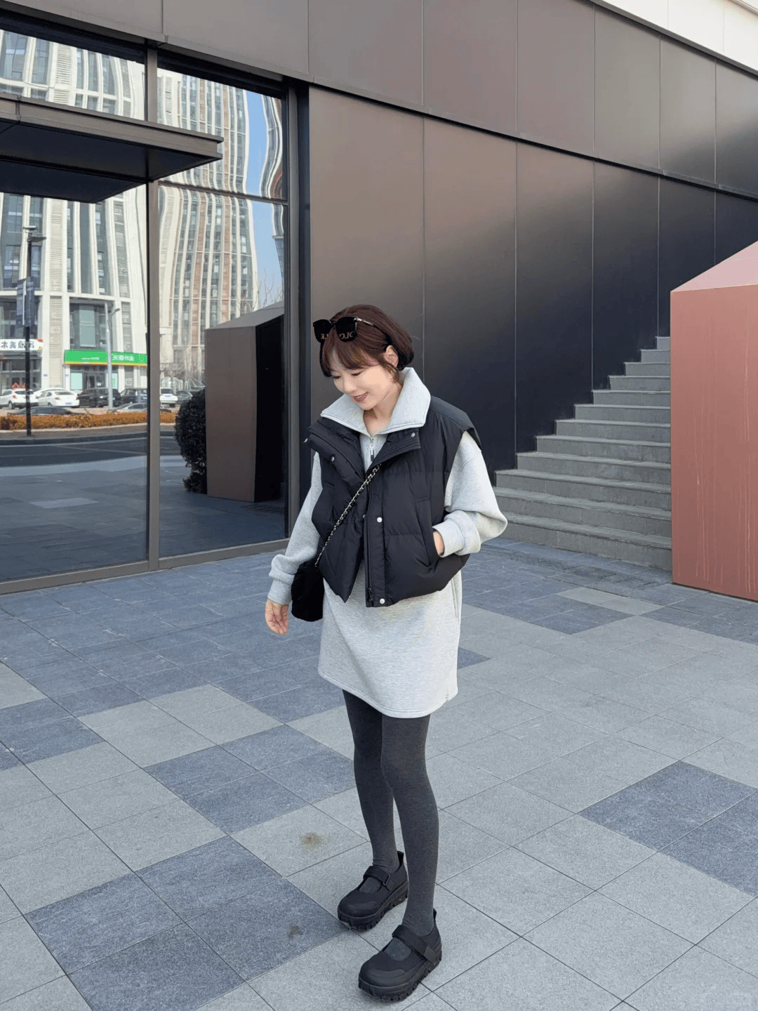 超短款羽绒马甲叠穿宽松的中长款卫衣,下半身搭配紧身的灰色打底裤,一松一紧间,赘肉隐形,线条利落,50+也能穿出轻盈高级感,而且整体造型单品的组合也超级减龄。