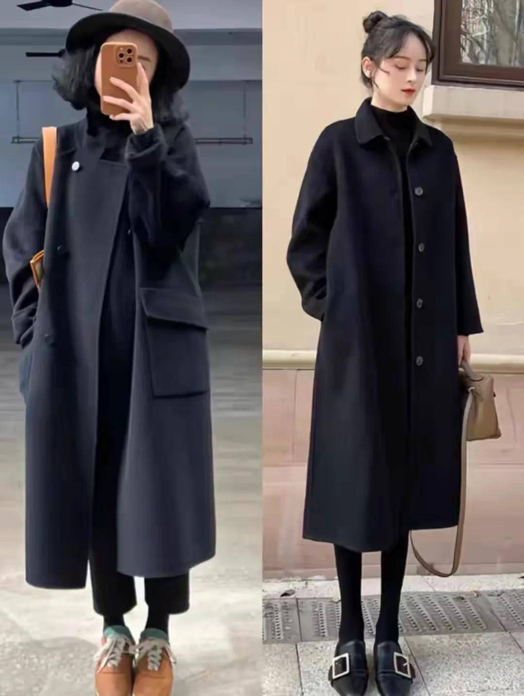 有的时候我们也没有必要用比较亮的颜色来点缀整个造型,像上面这两套穿衣对比,其实用整套顺色的衣服来组合反而更有品质。黑色大衣内搭黑色毛衣,加上黑色裙子,内搭黑色保暖打底裤,脚穿黑色单鞋,使得穿搭者的造型更上档次。