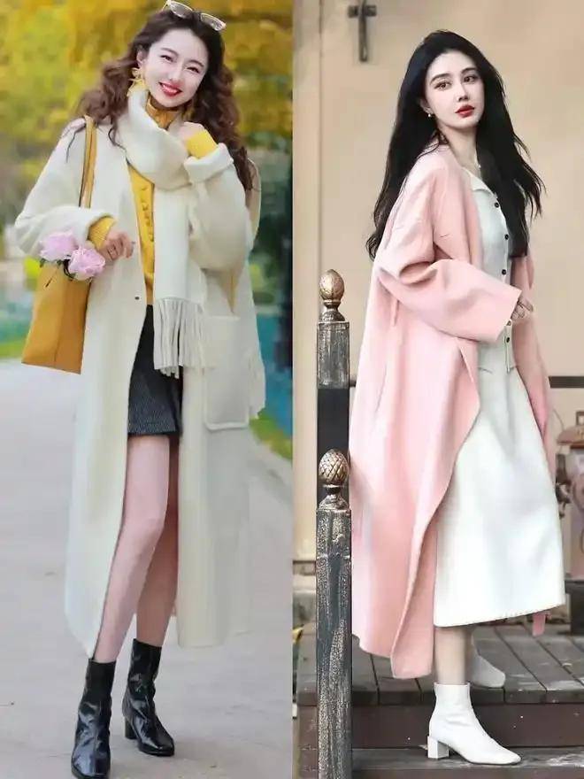 或者日常可以选择粉色的大衣,内搭白色针织开衫和白色的直筒半身裙,脚上穿的白色的短靴,这样的穿衣造型让你更有少女感,同时修饰肤色,显白显嫩。