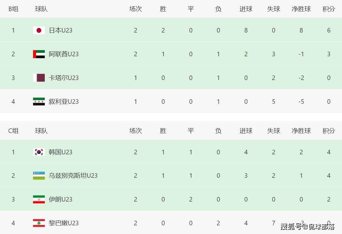 | B组 | 日本U23-阿联酋U23 | 3-0 | 日本全场压制,阿联酋半场0射门,日本两连胜积6分,若叙利亚不胜卡塔尔则提前出线 | 日本领跑B组,净胜球+8,出线形势极佳 |
