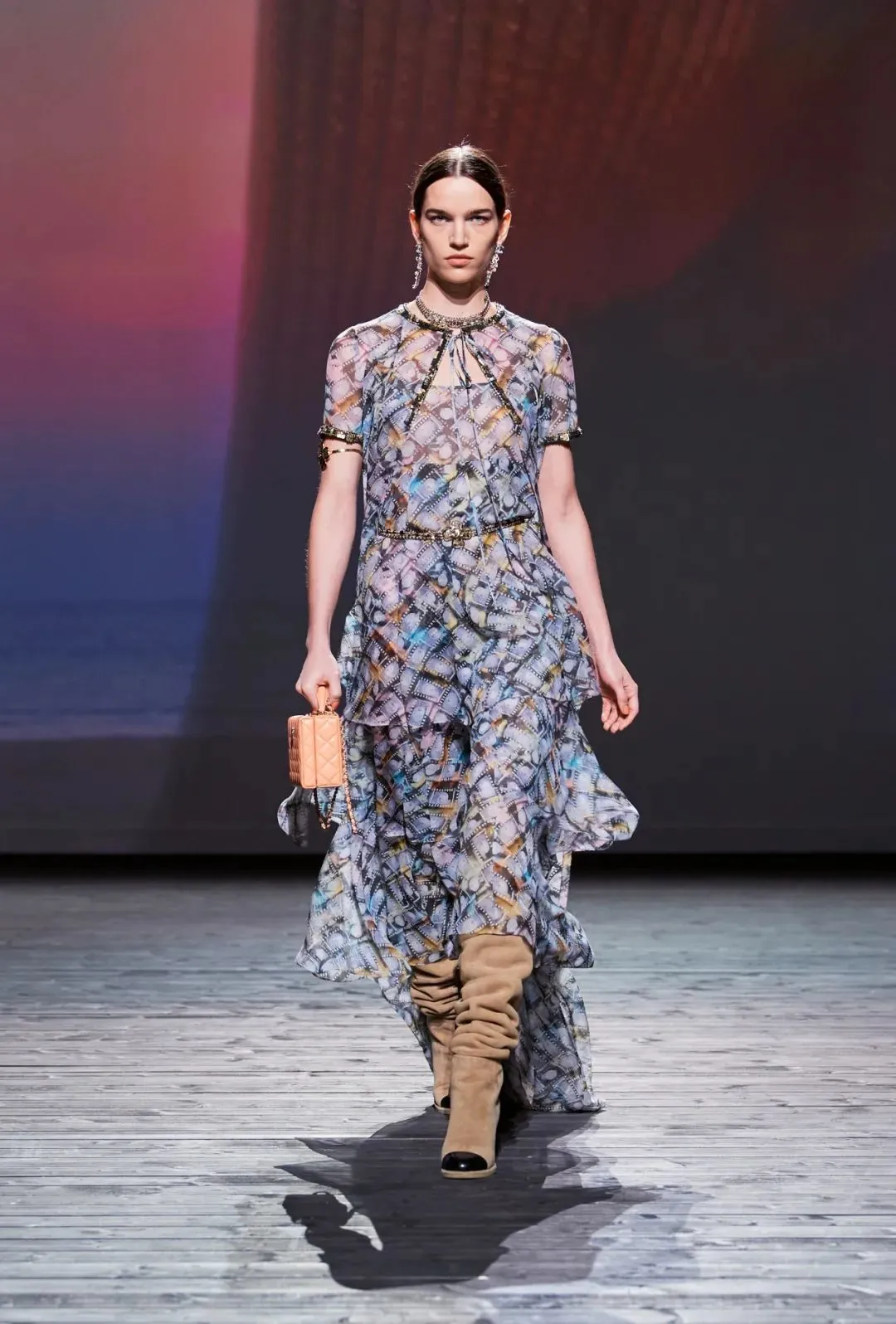 巴黎时间3月5日,Chanel创意总监Virginie Viard把杜维埃海滨步道搬进了巴黎大皇宫:“在这个系列中,我们重现了杜维埃的海滨步道,巨大的荧幕上,颀长而又浪漫的身影漫步在晨曦中,直到落日余晖。” 晚霞柔和的色彩化作这一季Chanel明媚的色板,粉色、淡紫色、橘色与淡蓝色等鲜明或柔和的色调,宛如杜维埃变幻莫测的天色。