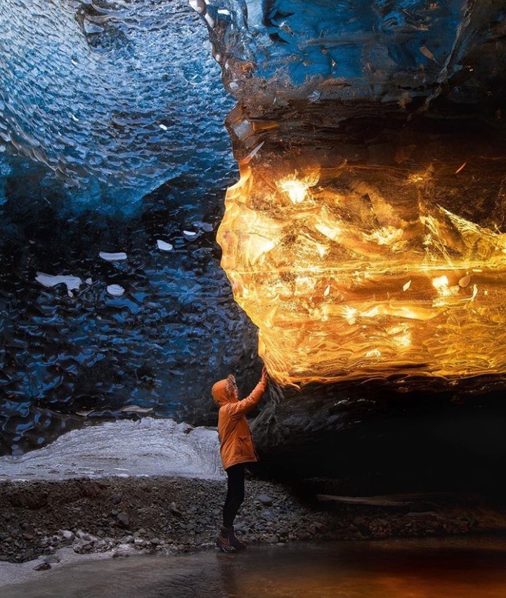 在冰岛的一个洞穴里,日落光折射进了洞穴,冰川变成了金色,看起来这个男孩像是在抚摸这只金龙一般。