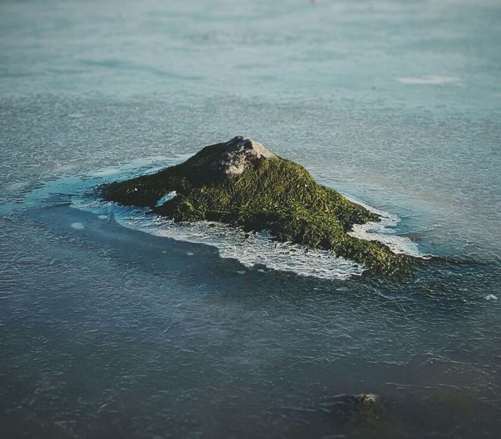 这看起来像不像海洋中的一座奇妙小岛,但其实只是水坑里一个长了青苔的石头。