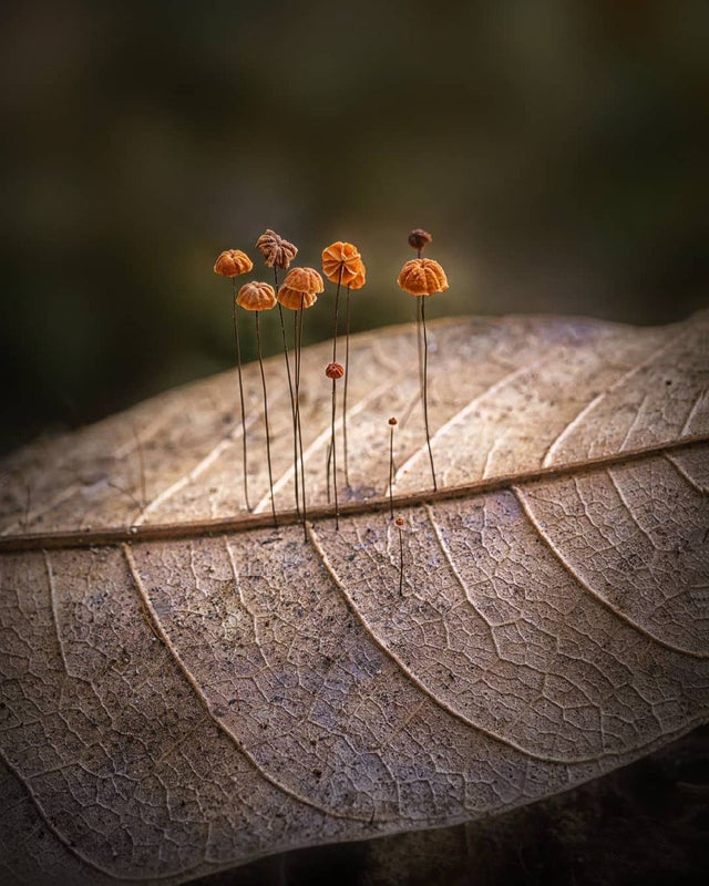 一片即将枯萎的叶子上面长出了一个个小蘑菇。