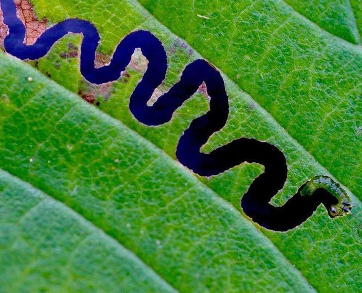 这看起来像不像是热带雨林中的亚马逊河,但其实这只是毛毛虫吃树叶留下的痕迹。