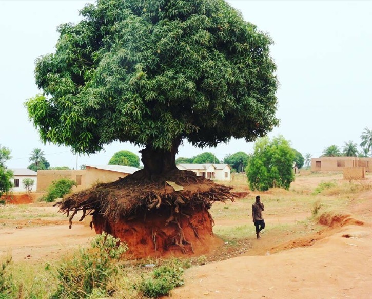 在坦桑尼亚的一棵树,由于周围自然灾害比较严重,水土大部分流失,但是这棵树仍然坚强地活着,紧靠着在下面那一点点的土地。