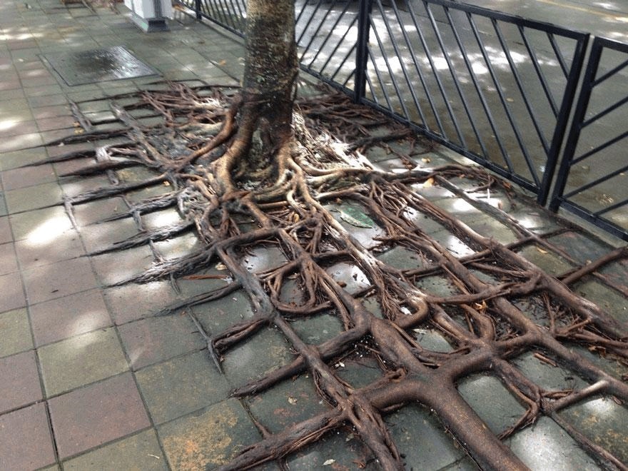 强迫症患者的福音,树木的根枝,有序地排列在每一个地砖上。