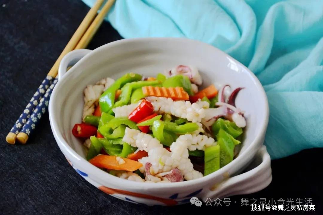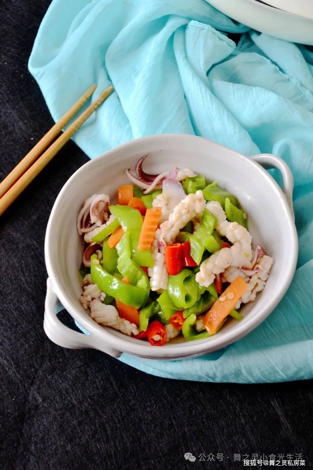 材料:鱿鱼 微辣青椒 胡萝卜 红尖椒少许